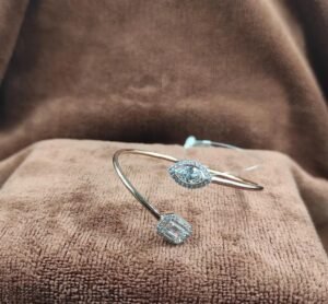 A sleek open-bangle adorned with a pear‑cut and an emerald‑cut lab‑grown diamond set in halo accents.