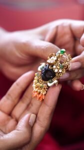 The sreenath ji pendant is a gold-faced decorative charm featuring a black-faced deity (likely Krishna) with intricate gold jewellery, gemstones, and a dangling leaf motif.