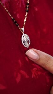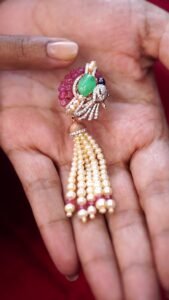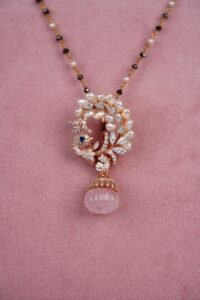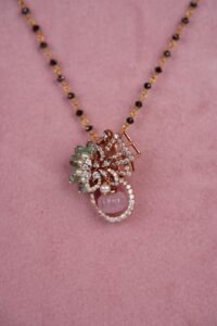 The pendant features lord Ganesha’s charm adorned with green stones, diamonds, and a clear crystal drop.