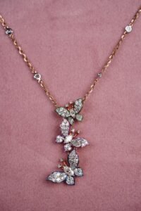 A gold chain with a sparkling trio of diamond‑set butterfly pendants.