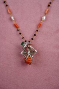 A geometric pendant with orange, green, and transparent stones on a gold chain adorned with orange, black, and pearl beads.