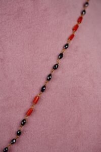 A gold chain with black and orange beads and a pendant featuring a transparent stone above two red stones surrounded by diamonds.