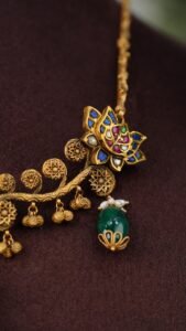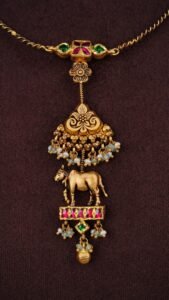 A gold necklace with three lotus motifs set with blue, pink and white stones, featuring green drop pendants and a central cow charm pendant.