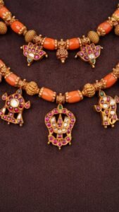 The necklace is a double-layered gold necklace with orange coral beads and intricate pink-stone shanku chakra namalu pendants.