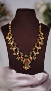 The necklace is a gold haram adorned with green stones, bird motifs, and jhumka pendants, featuring a central decorative pendant with ruby accents.