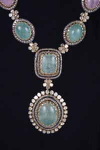 A polki diamond and blue-stone necklace with a large hexagonal pendant and pearl drops.