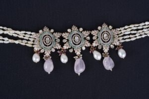 This is an elegant choker with three diamond-studded circular motifs, pearl-drop pendants, and multi-strand pearl chains.