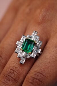 A labgrown diamond ring with a central emerald-cut green stone surrounded by a double-layer halo of baguette-cut clear stones.