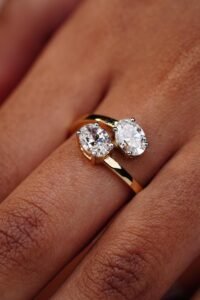 A gold band with two oval-cut diamonds set side by side in a two-stone ring design.