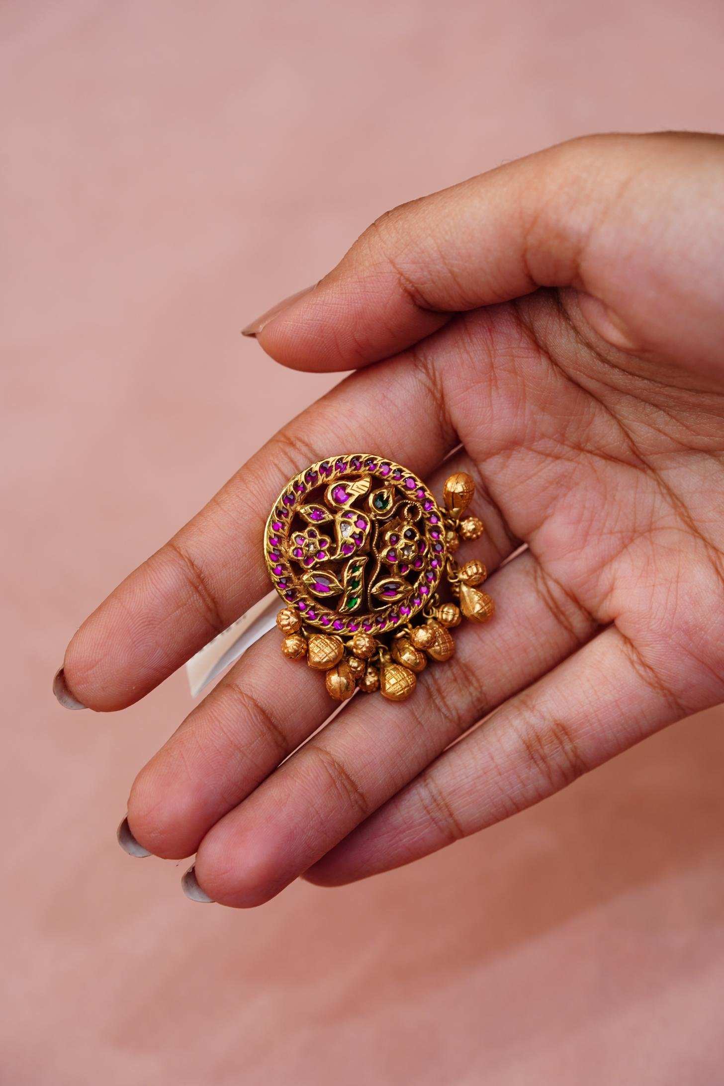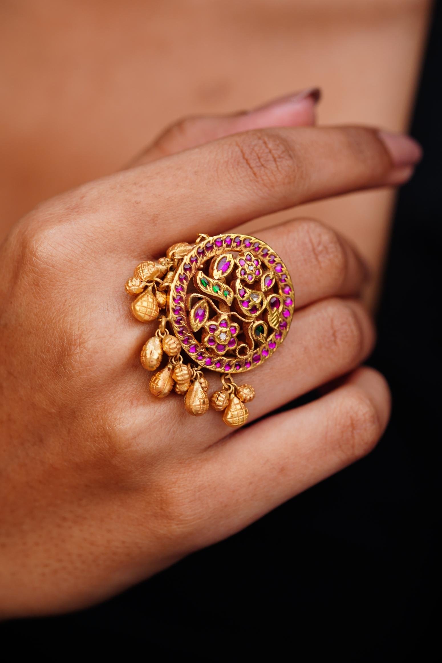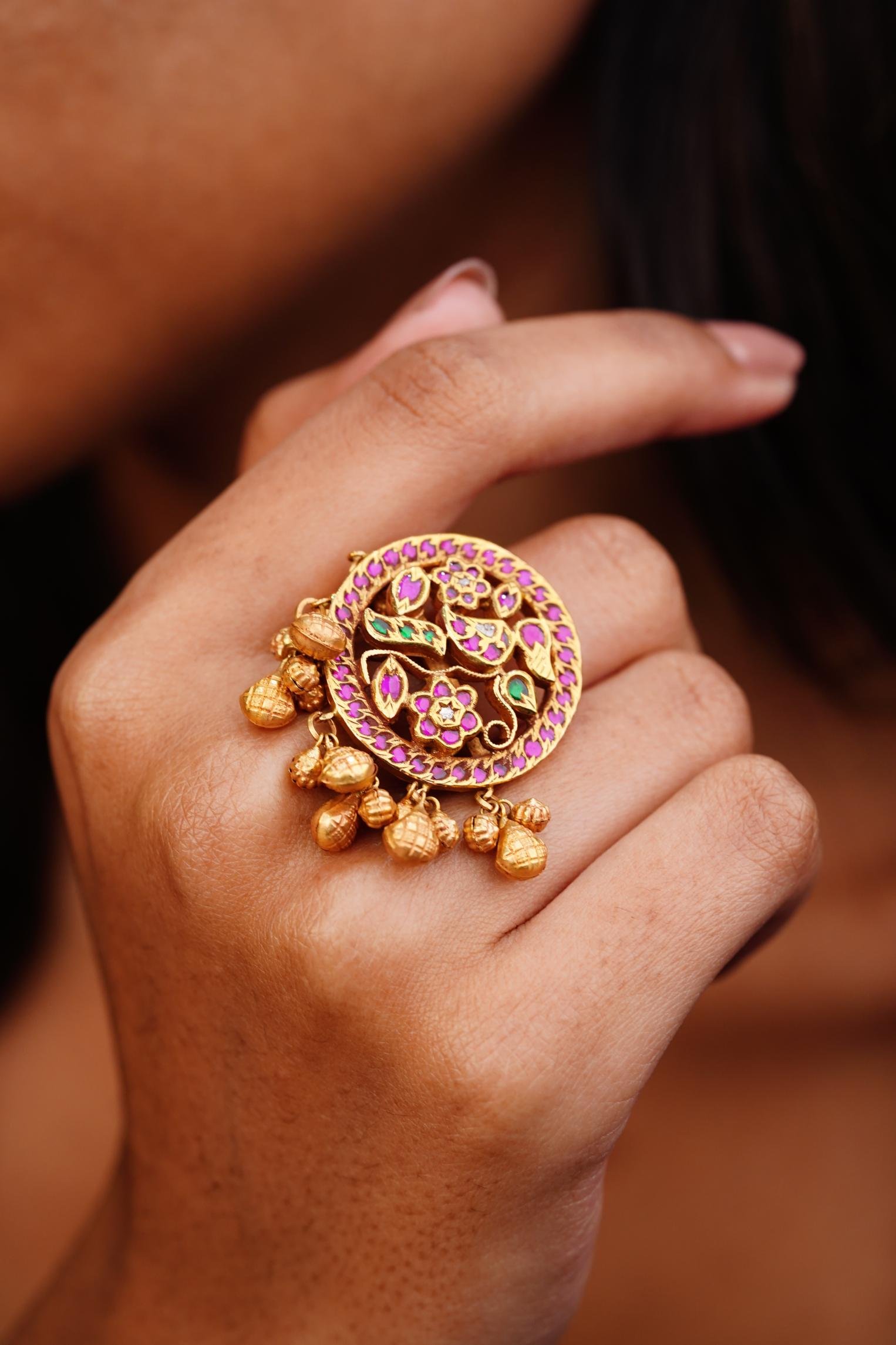 A gold cocktail ring with a circular floral design set in pink gemstones and green accents, finished with dangling gold teardrop beads.