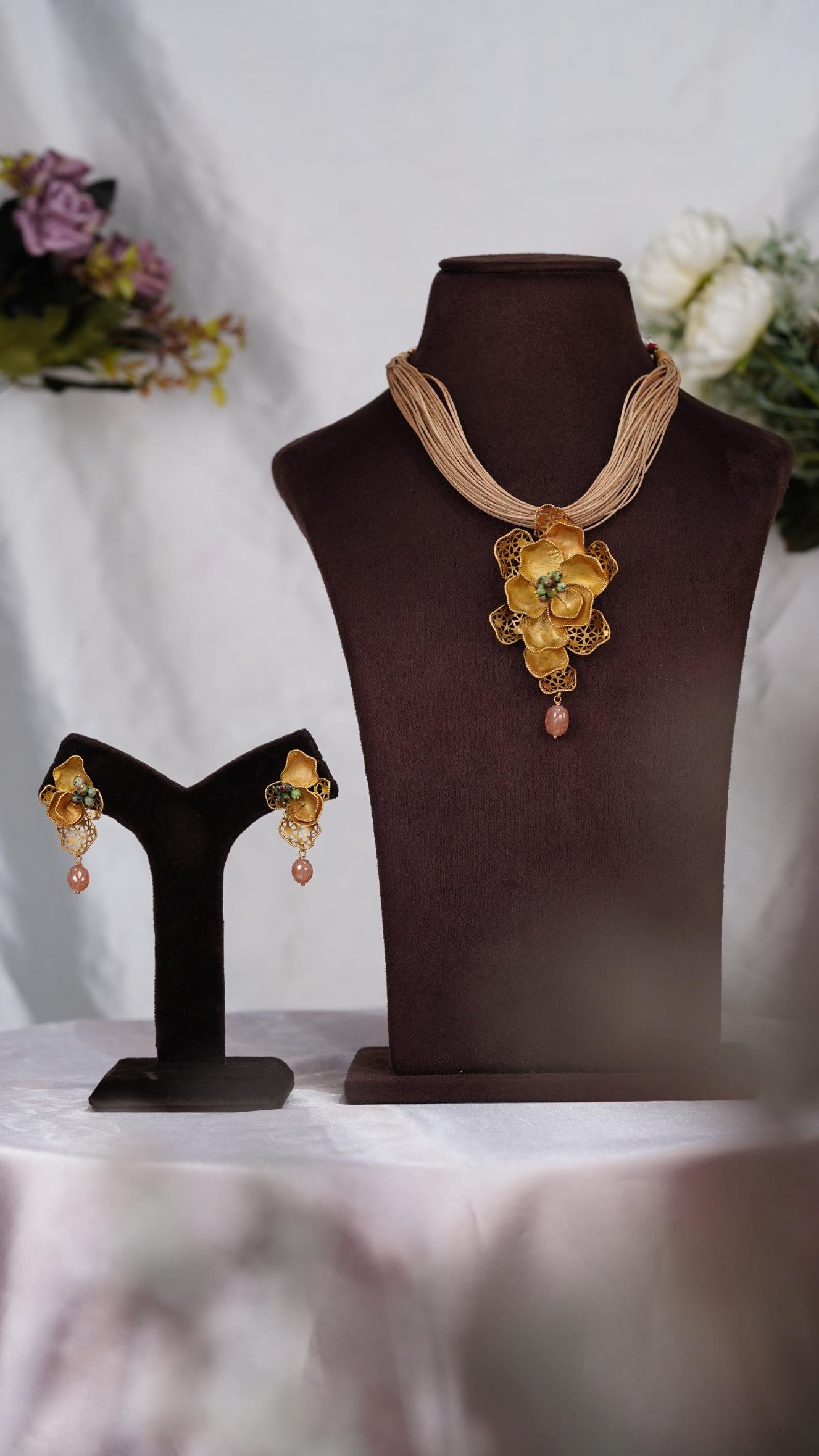 Gold floral earrings with a peach gemstone hanging down.