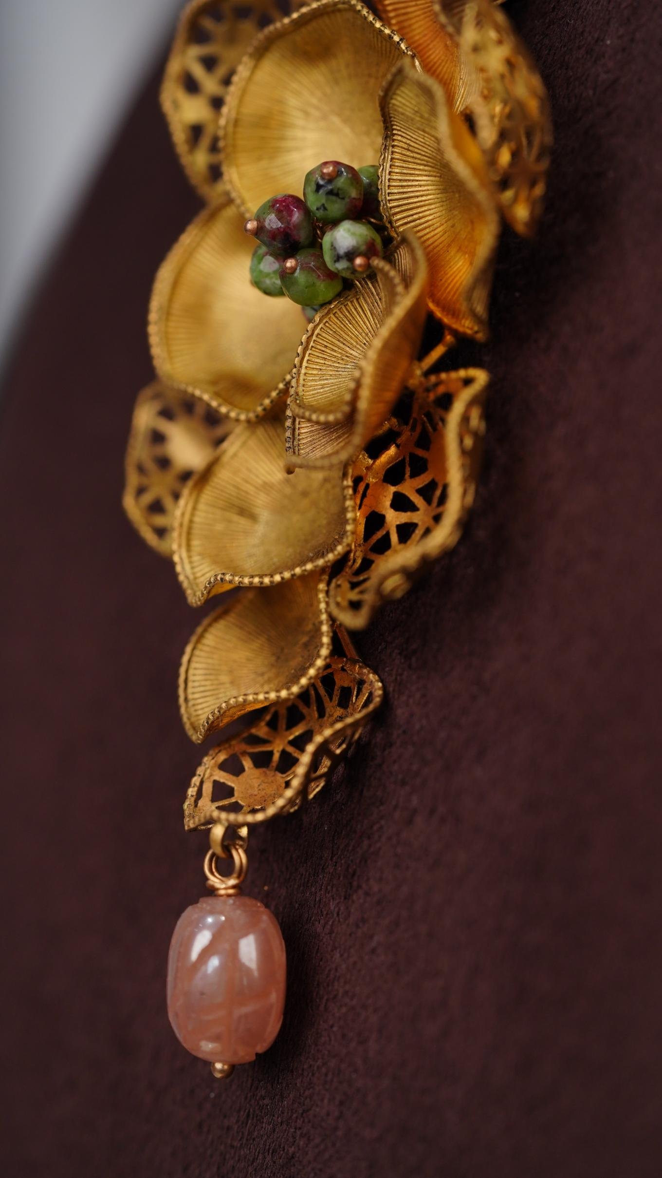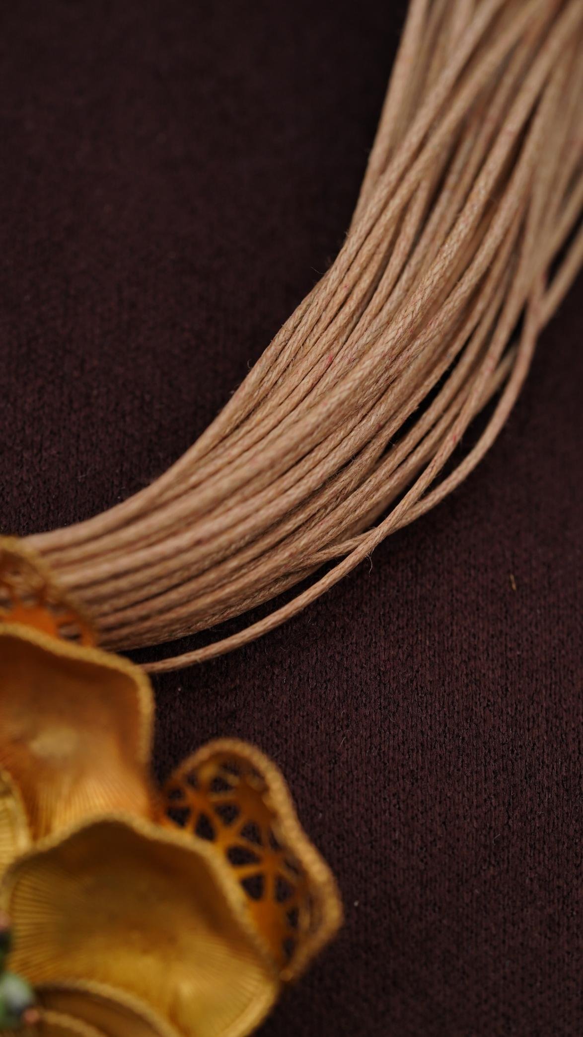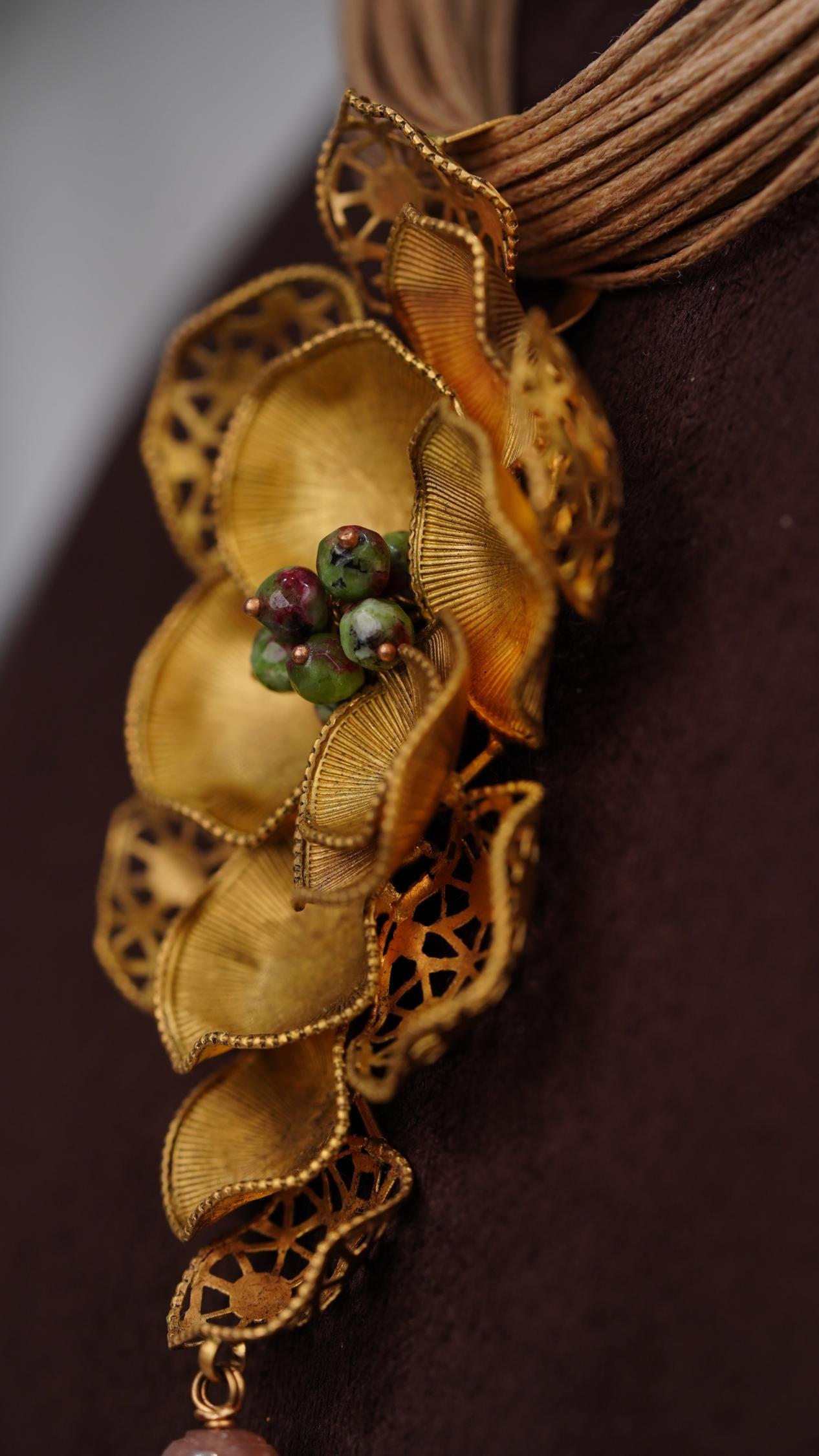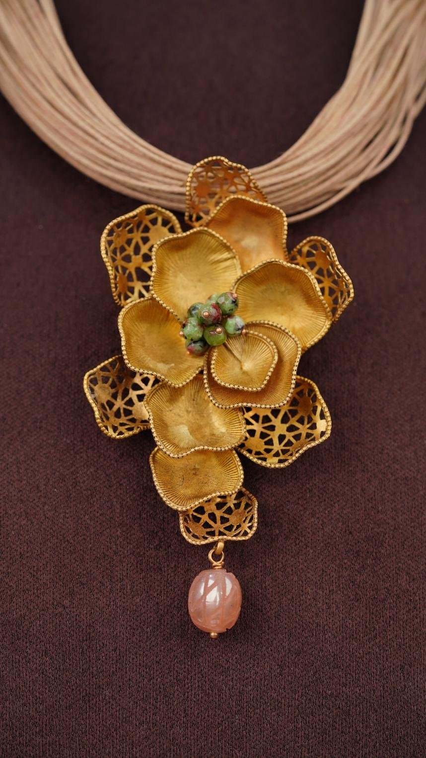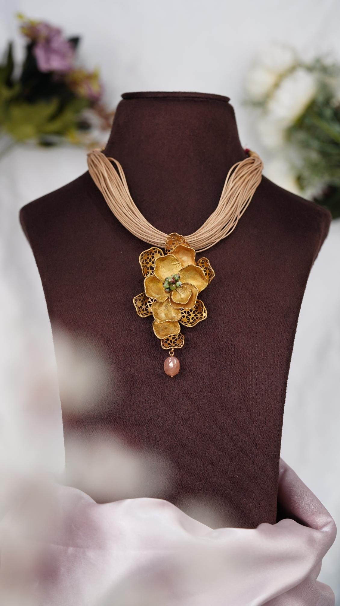 A gold floral pendant with a peach gemstone, set on a woven jute-thread necklace.