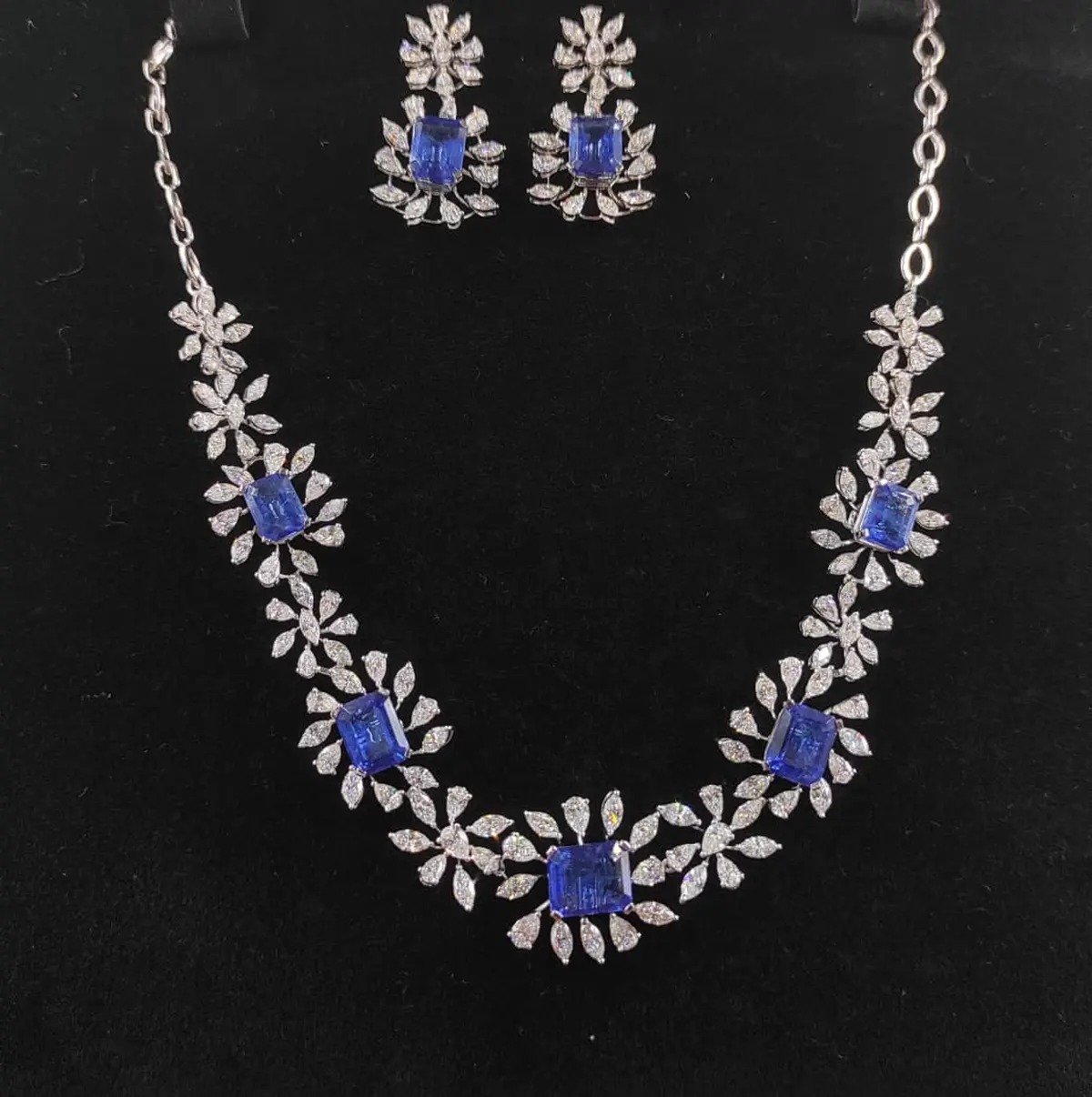 A sleek necklace featuring four radiant blue emerald‑cut stones framed by sparkling diamond‑studded leaf motifs, paired with matching blue‑centered diamond floral earrings that deliver an elegant, eye‑catching blue‑sparkle finish.
