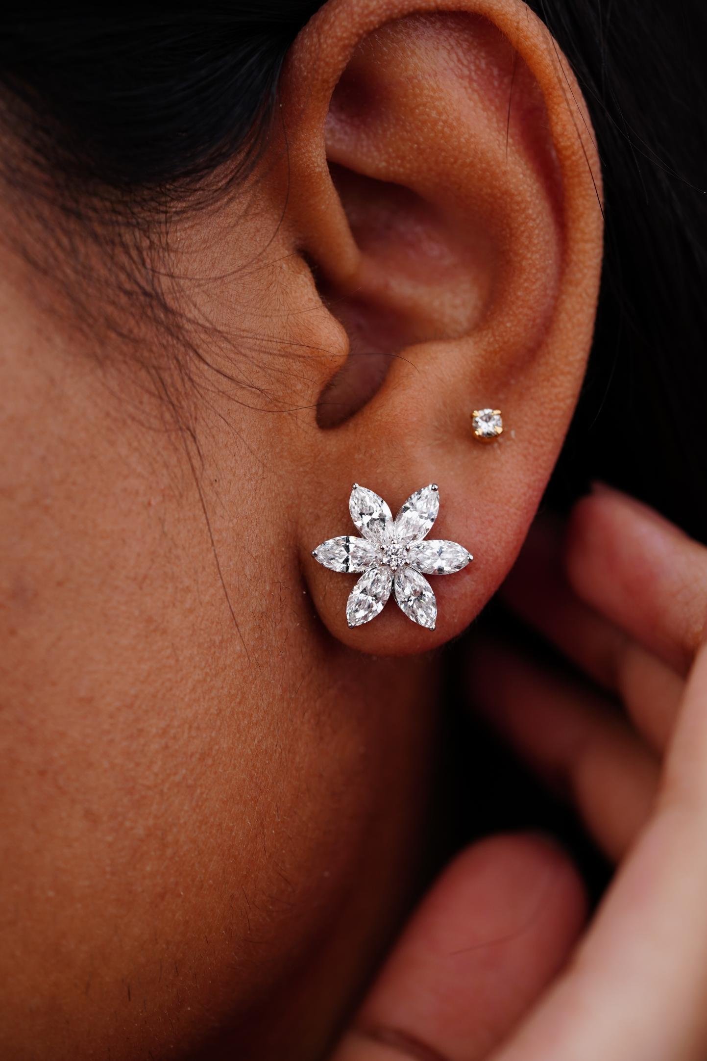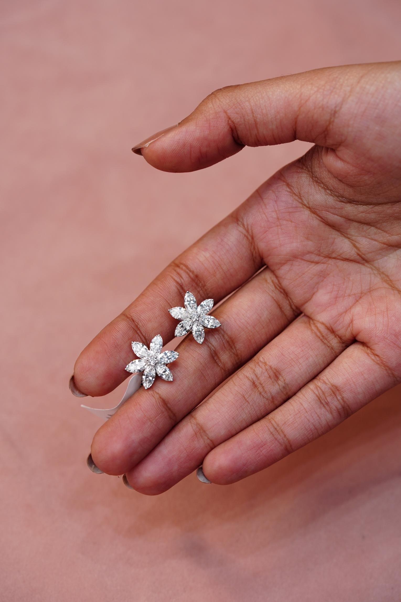 Elegant flower‑shaped stud earrings with six marquise‑cut diamond petals surrounding a central diamond.