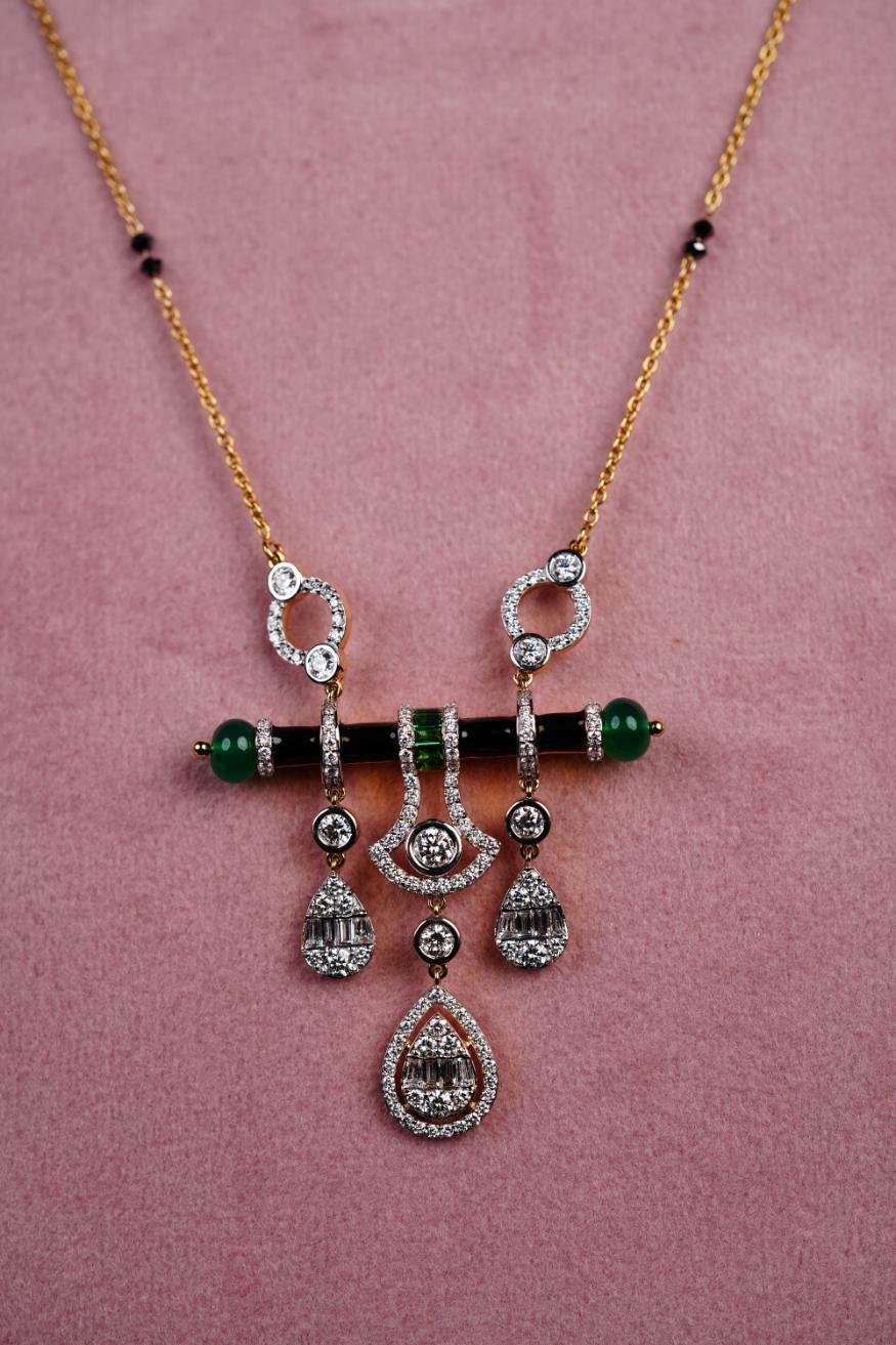 A mangalsutra with black beads, diamond-studded circular and green accents, featuring three pendant charms including a teardrop diamond piece.