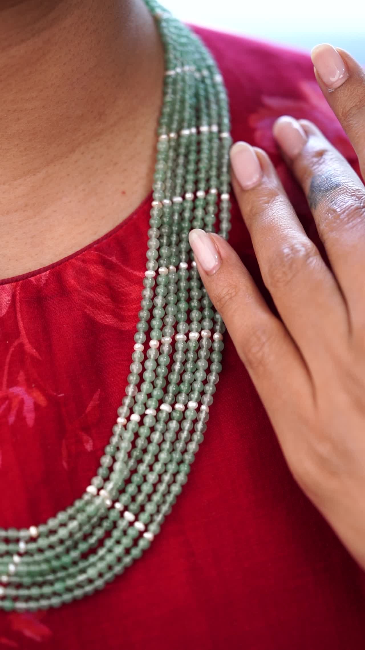 A multi-strand pastel blue enamel bead necklace with side floral pendants centered by diamond-like motifs.