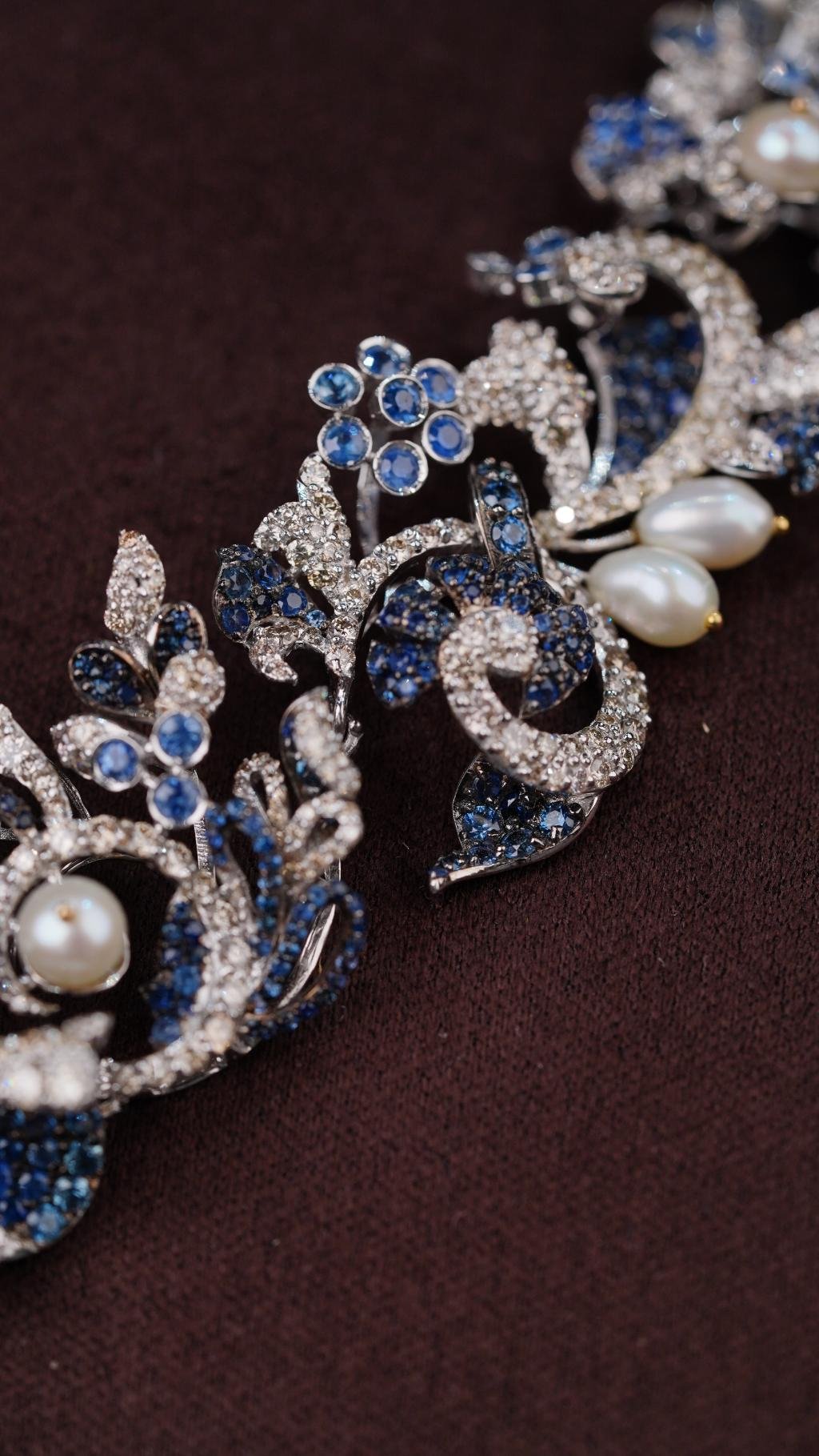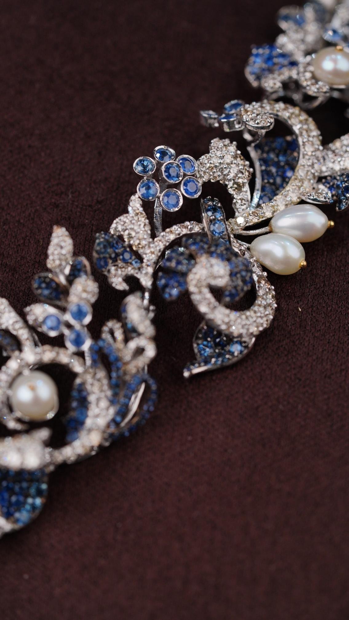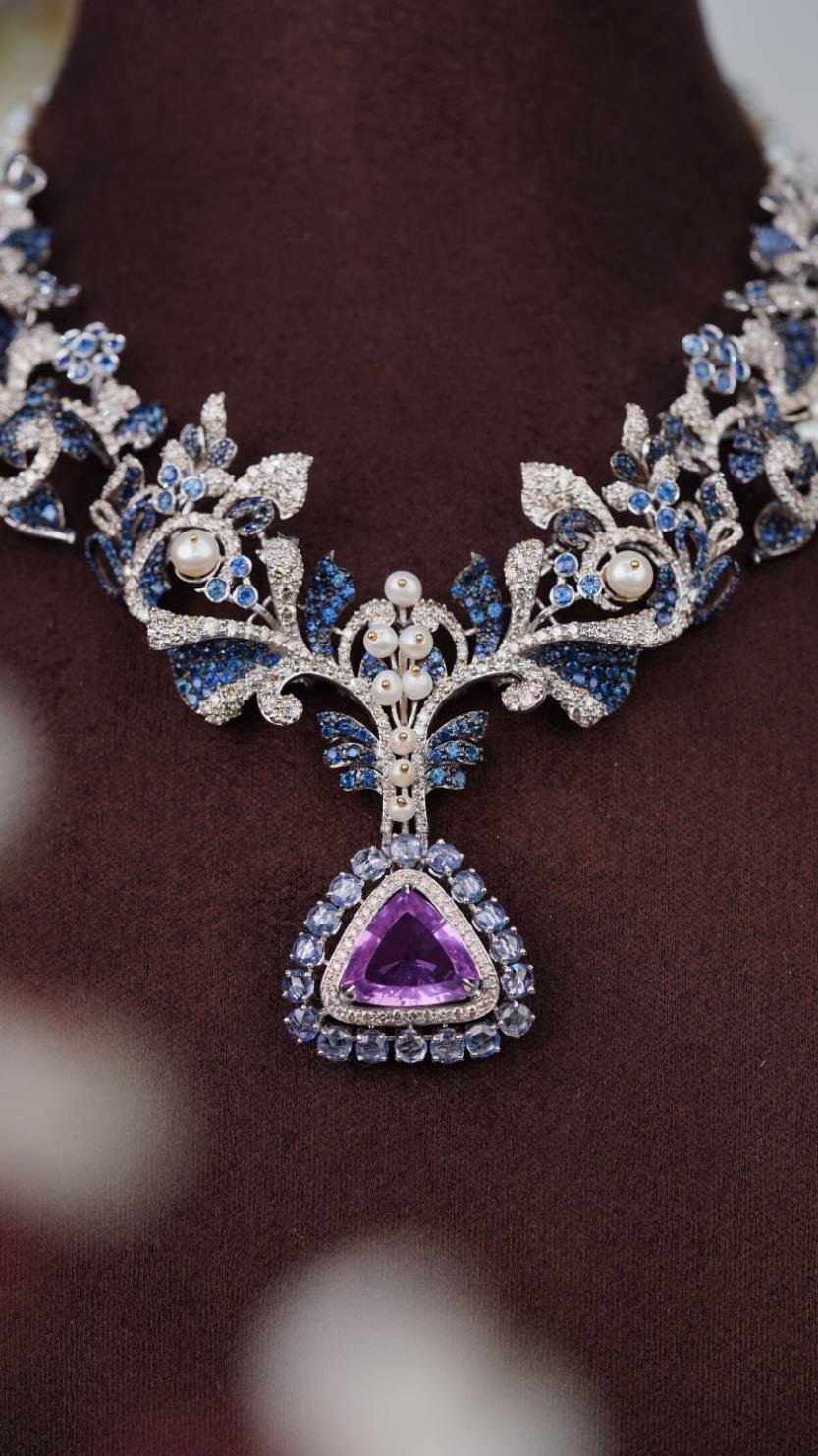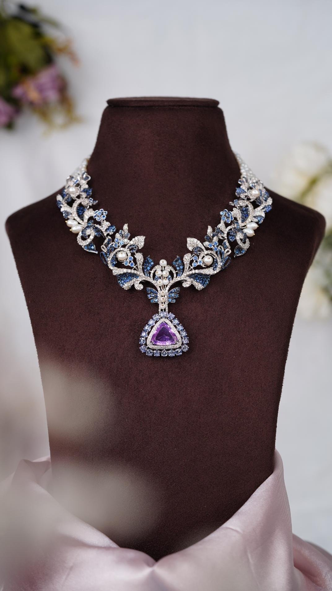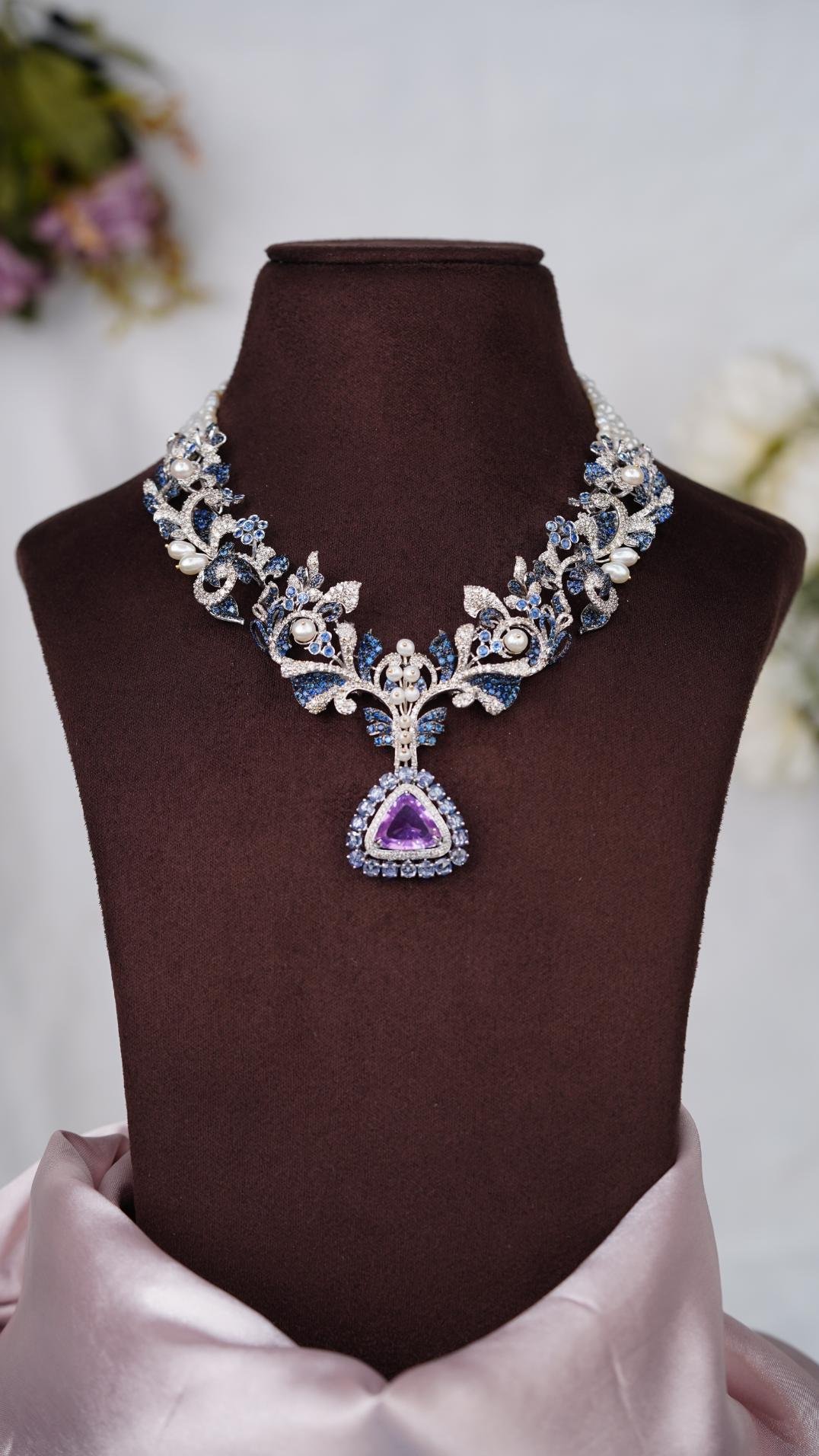 A white and blue floral necklace with diamond accents and a large triangular kunzite pendant surrounded by smaller diamonds.