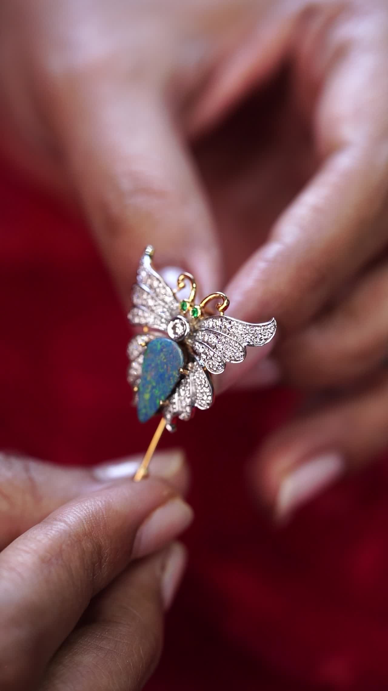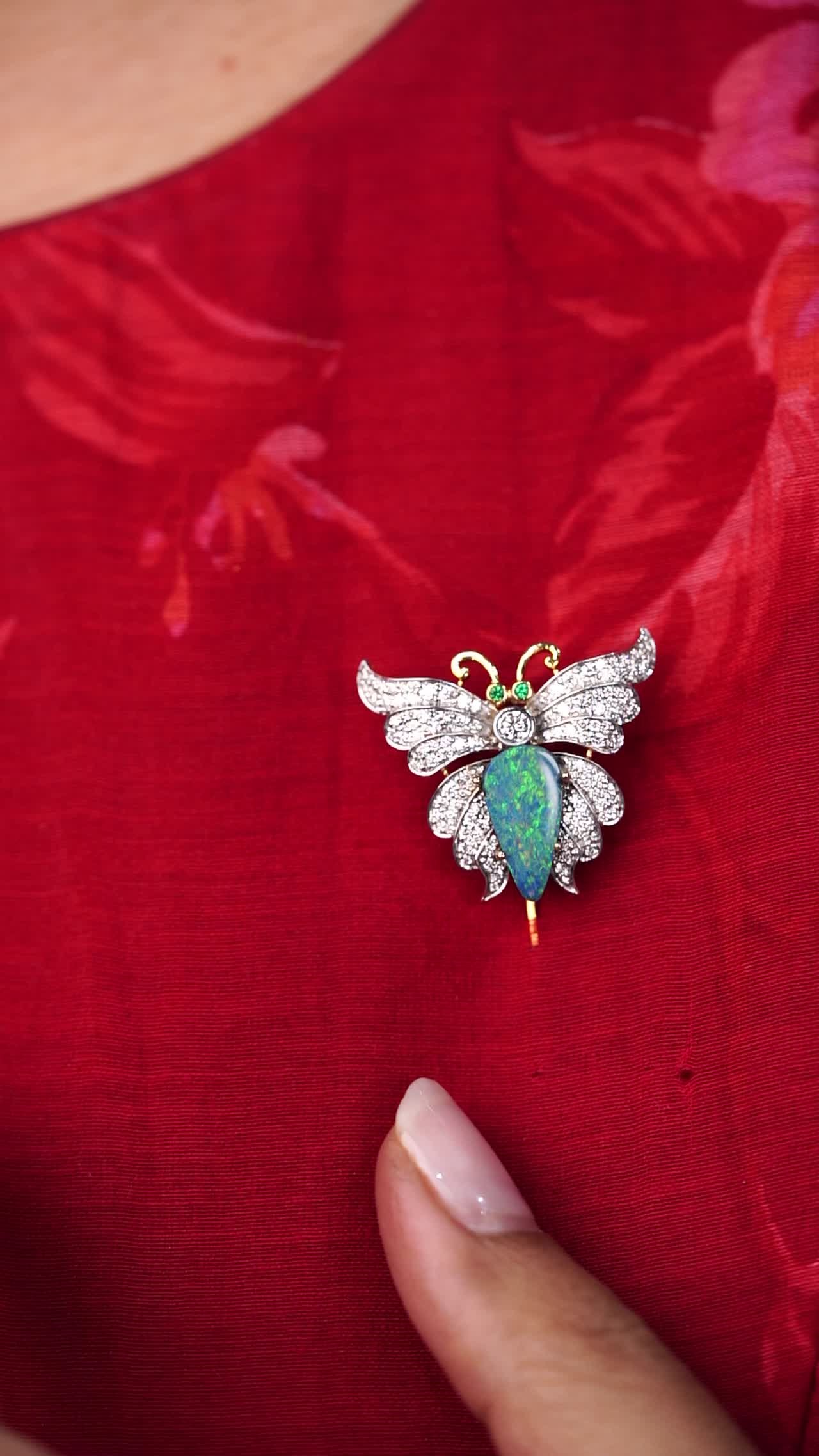 A butterfly brooch with diamond‑set wings and a blue opal body accented by emerald eyes.