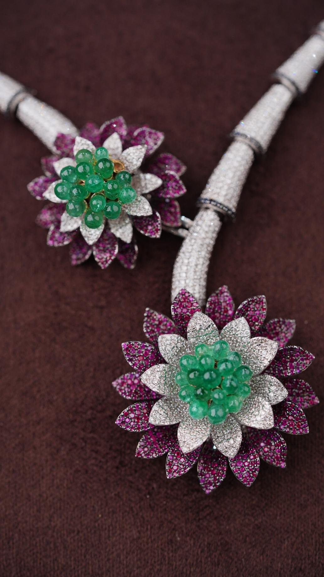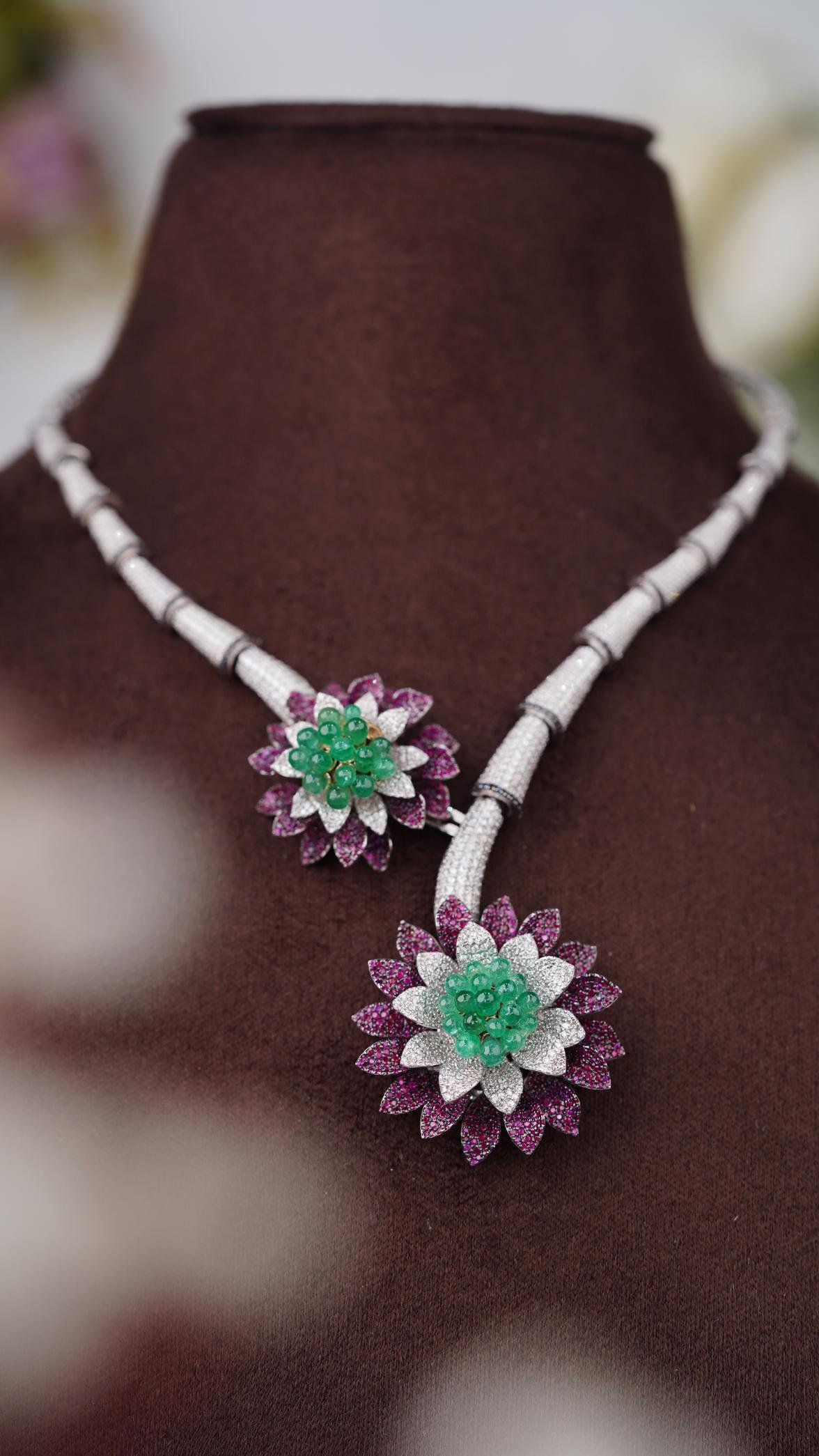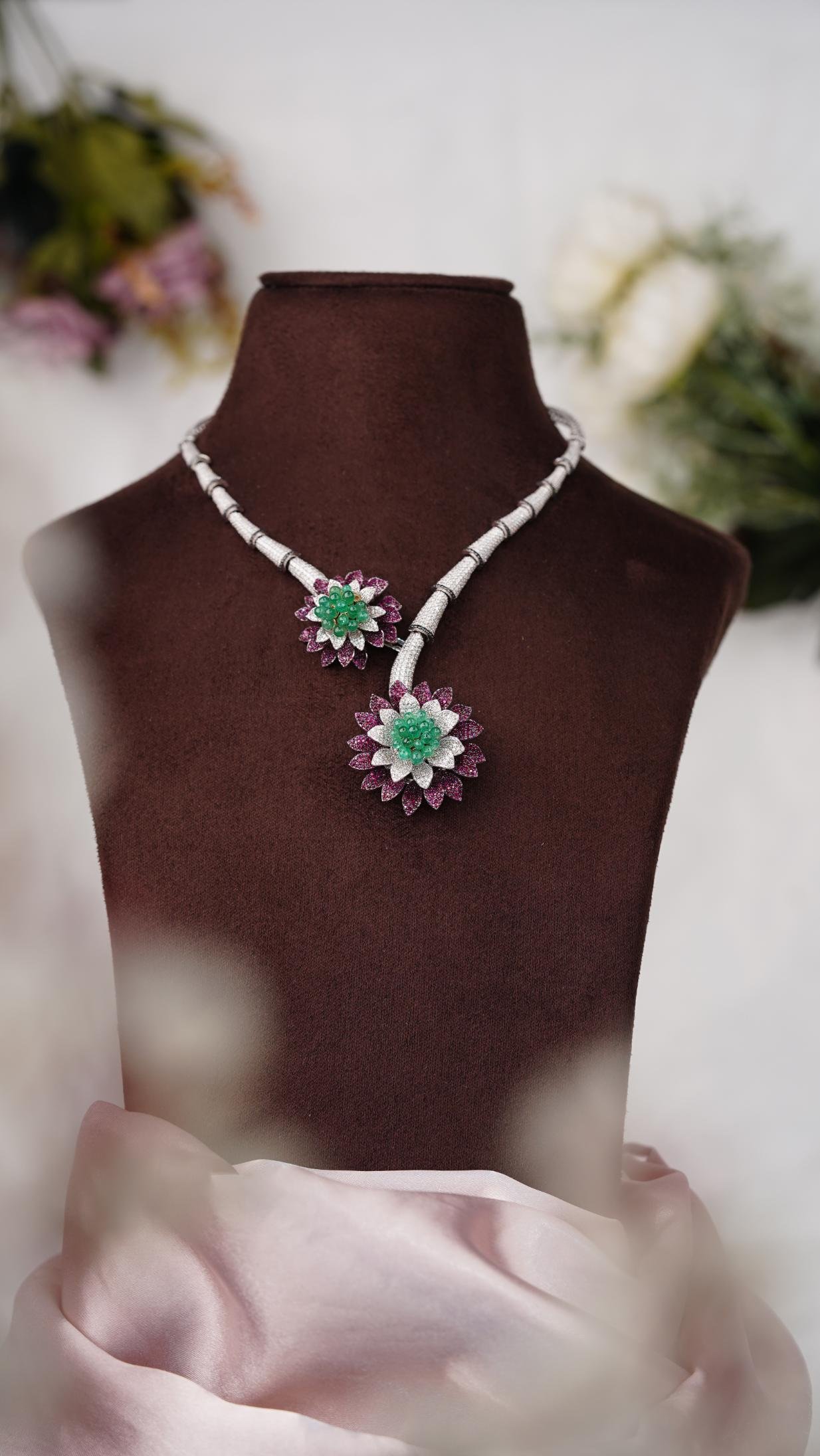 The necklace is a diamond-studded silver necklace with two flower-shaped pendants, each featuring a green gemstone center surrounded by white diamonds and purple diamond petals.