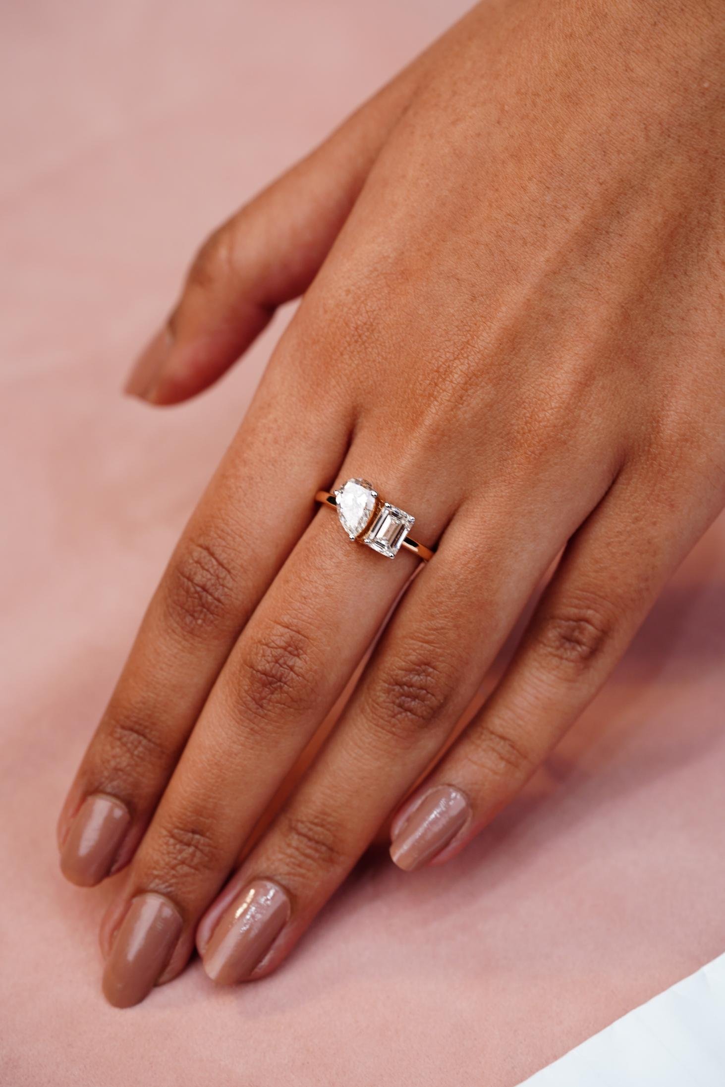 A gold band featuring an emerald‑cut (rectangle) diamond next to a pear‑shaped diamond.