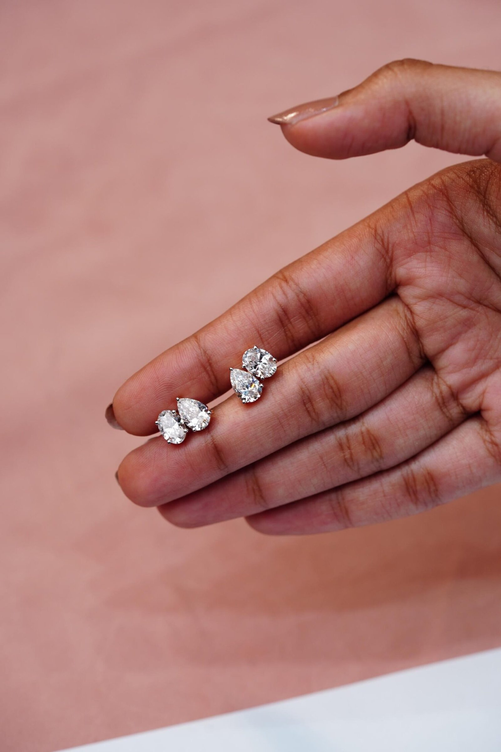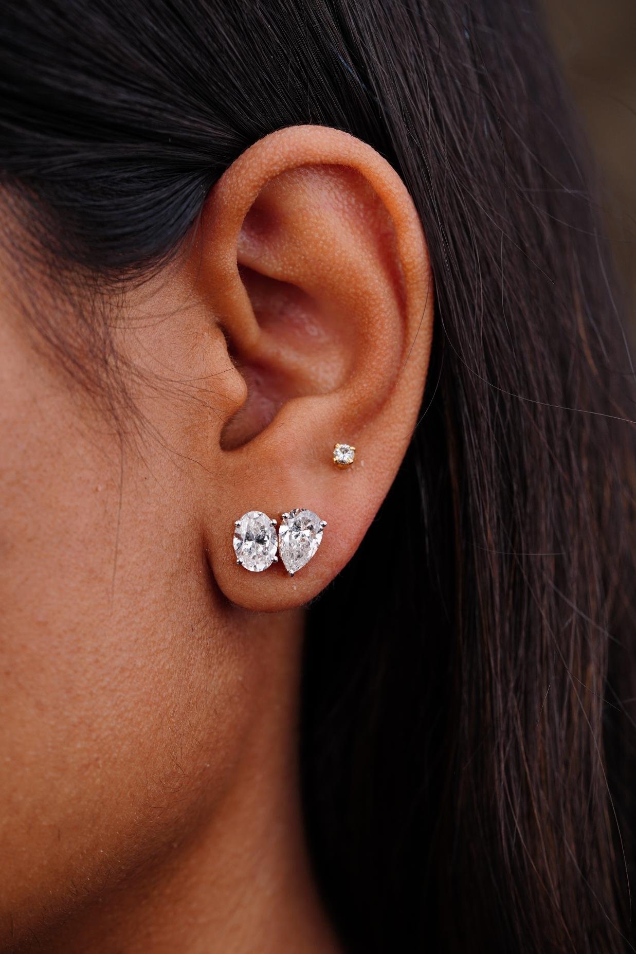Stunning two‑stone stud earrings with a pear‑shaped diamond set beside an oval diamond in a minimalist design.