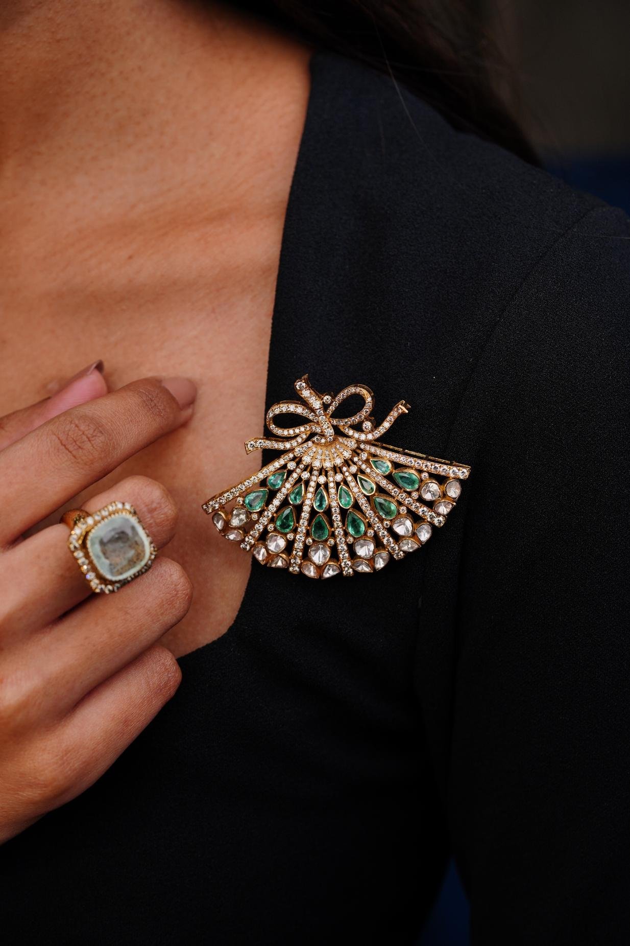 A gold fan‑shaped brooch set with white diamonds and green emerald accents, finished with a decorative bow at the base.