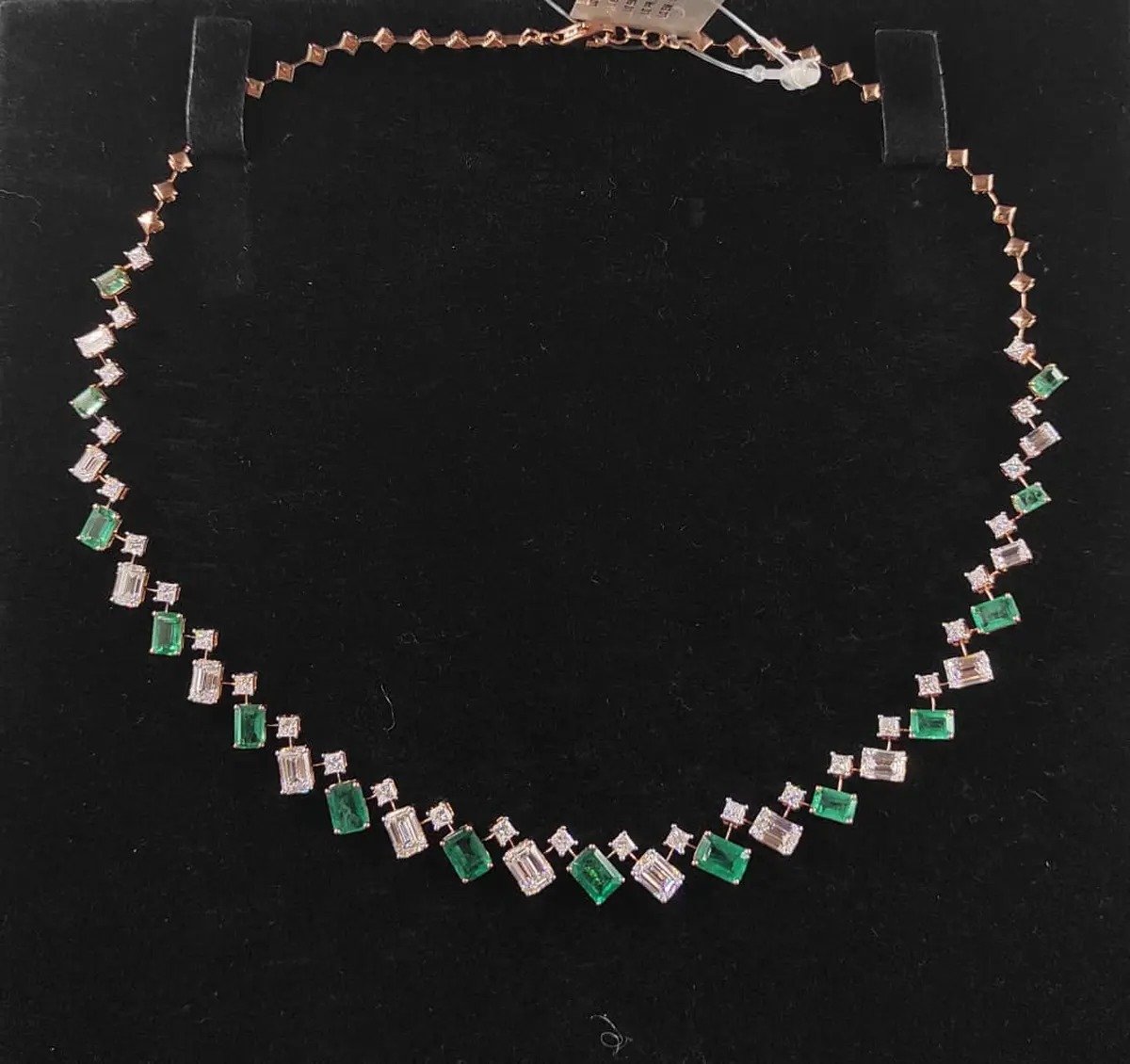 A rose‑gold necklace featuring alternating emerald‑cut green stones and brilliant square diamonds that sparkle with elegant contrast.