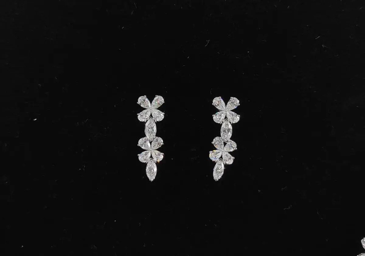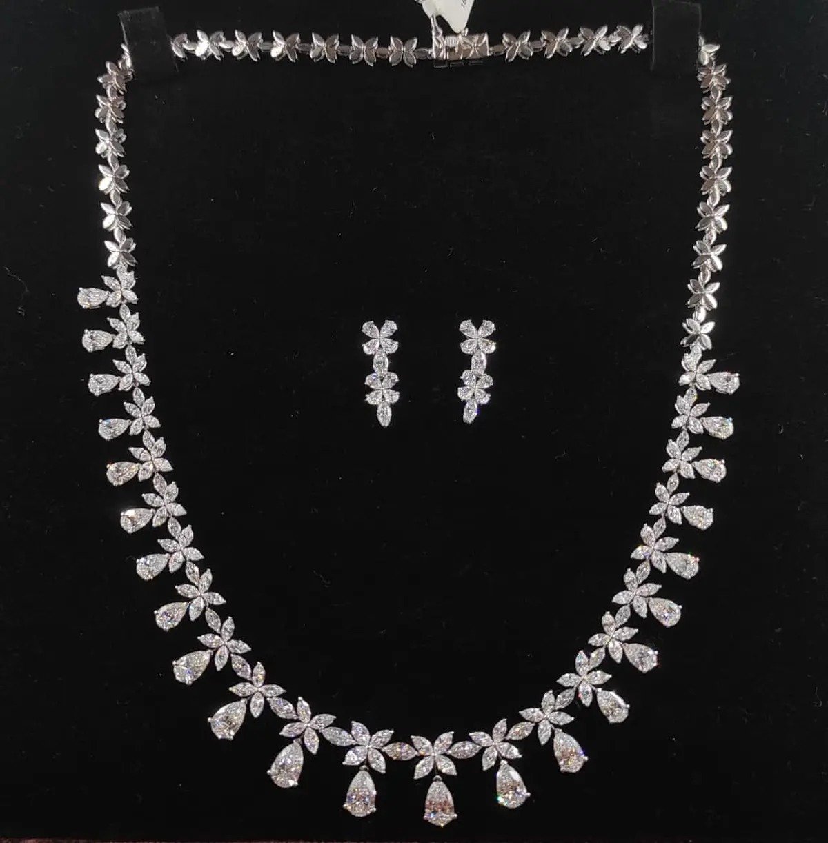 The necklace set with earrings is a dazzling floral design featuring sparkling diamond-like stones arranged in delicate flower motifs with teardrop accents.