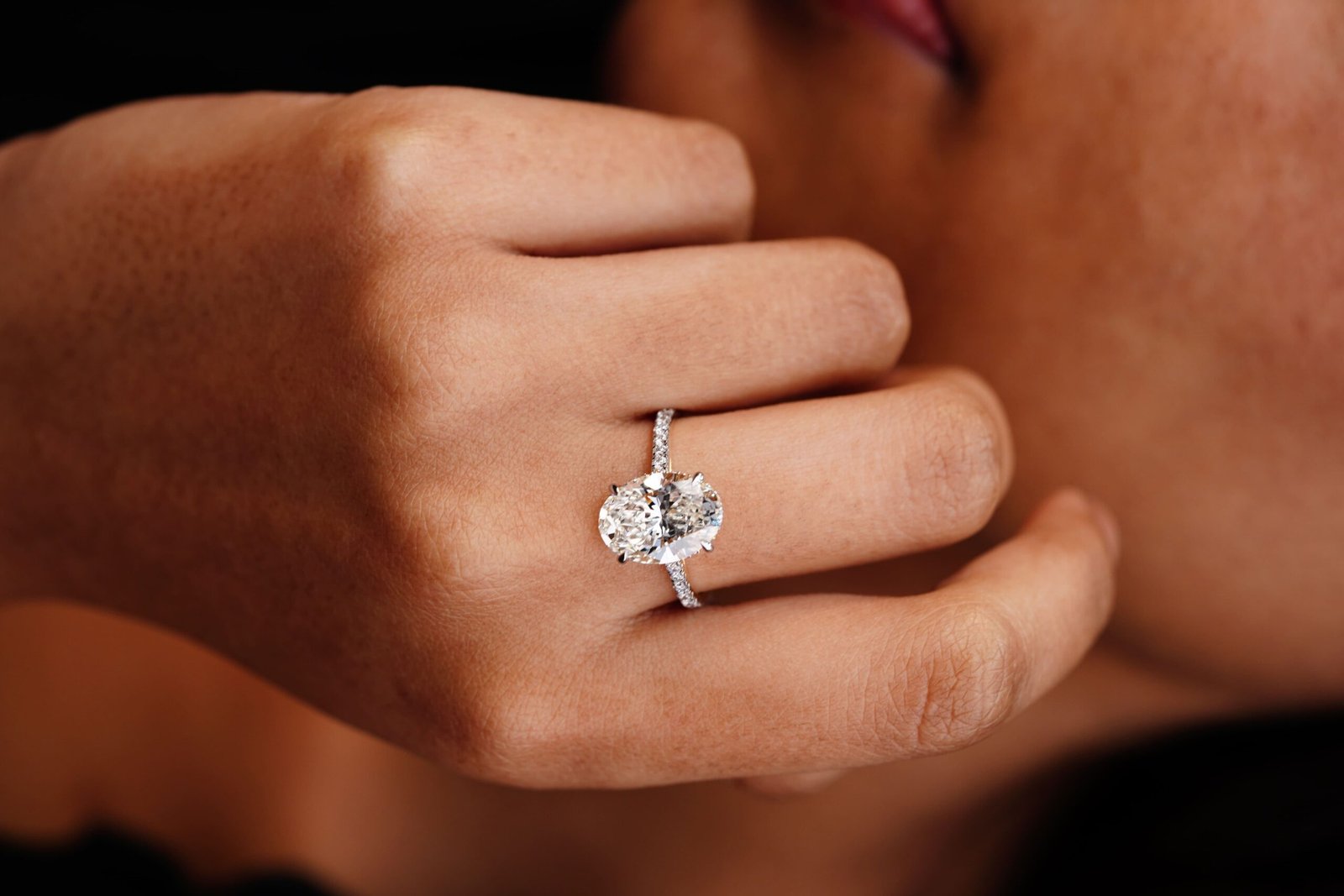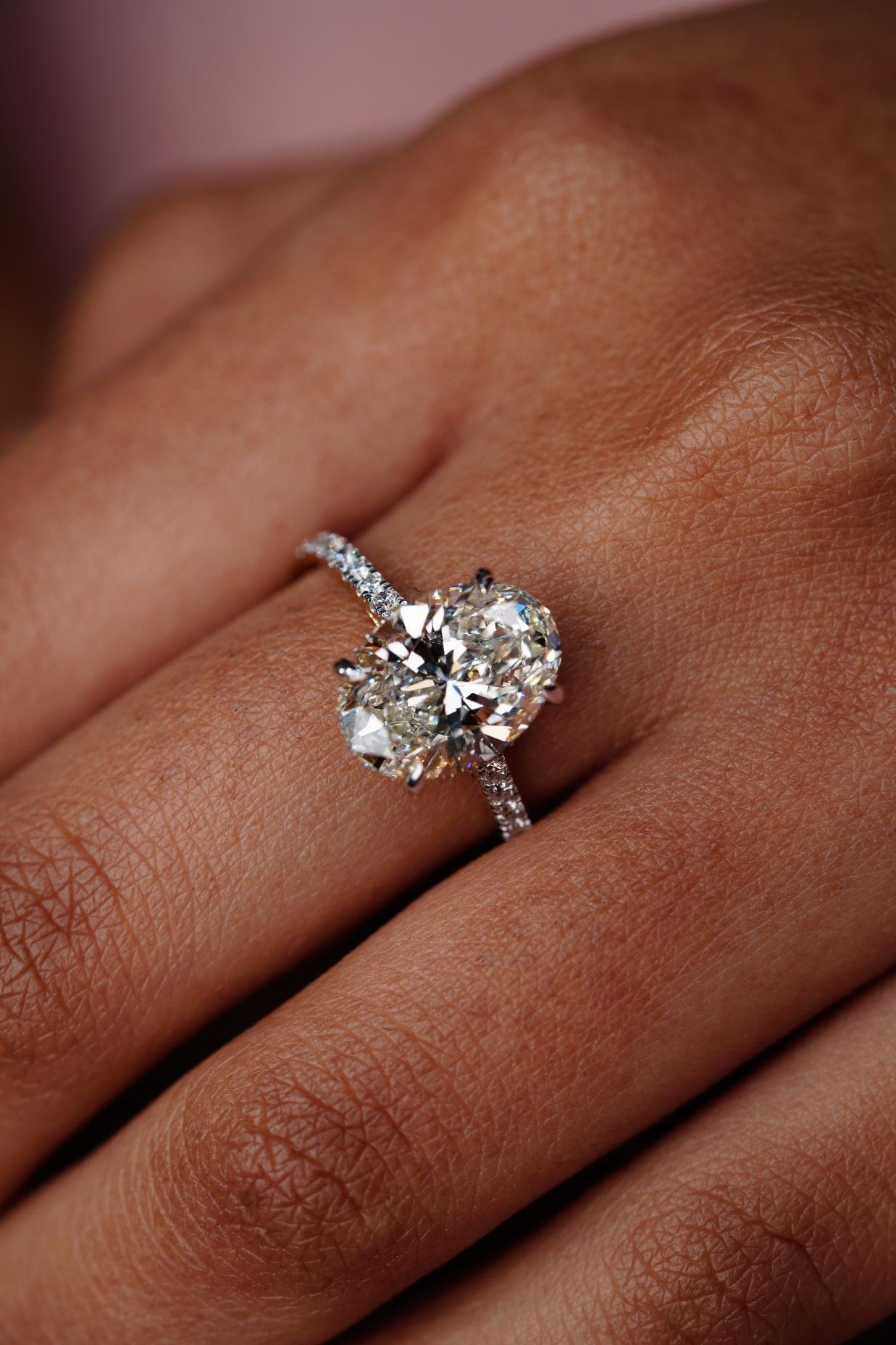 An elegant oval-cut diamond solitaire set in a slender white-metal band with tiny accent stones on the shoulders.
