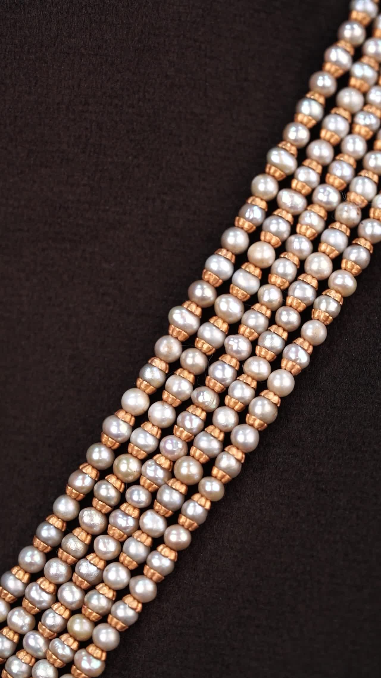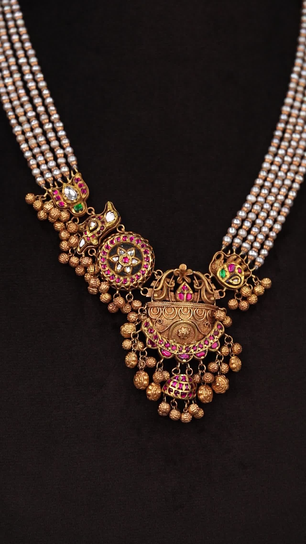 A fancy Rajwada-style necklace with layered pearl strands, ornate meenakari work, and graceful gold bead drops for a royal festive look.