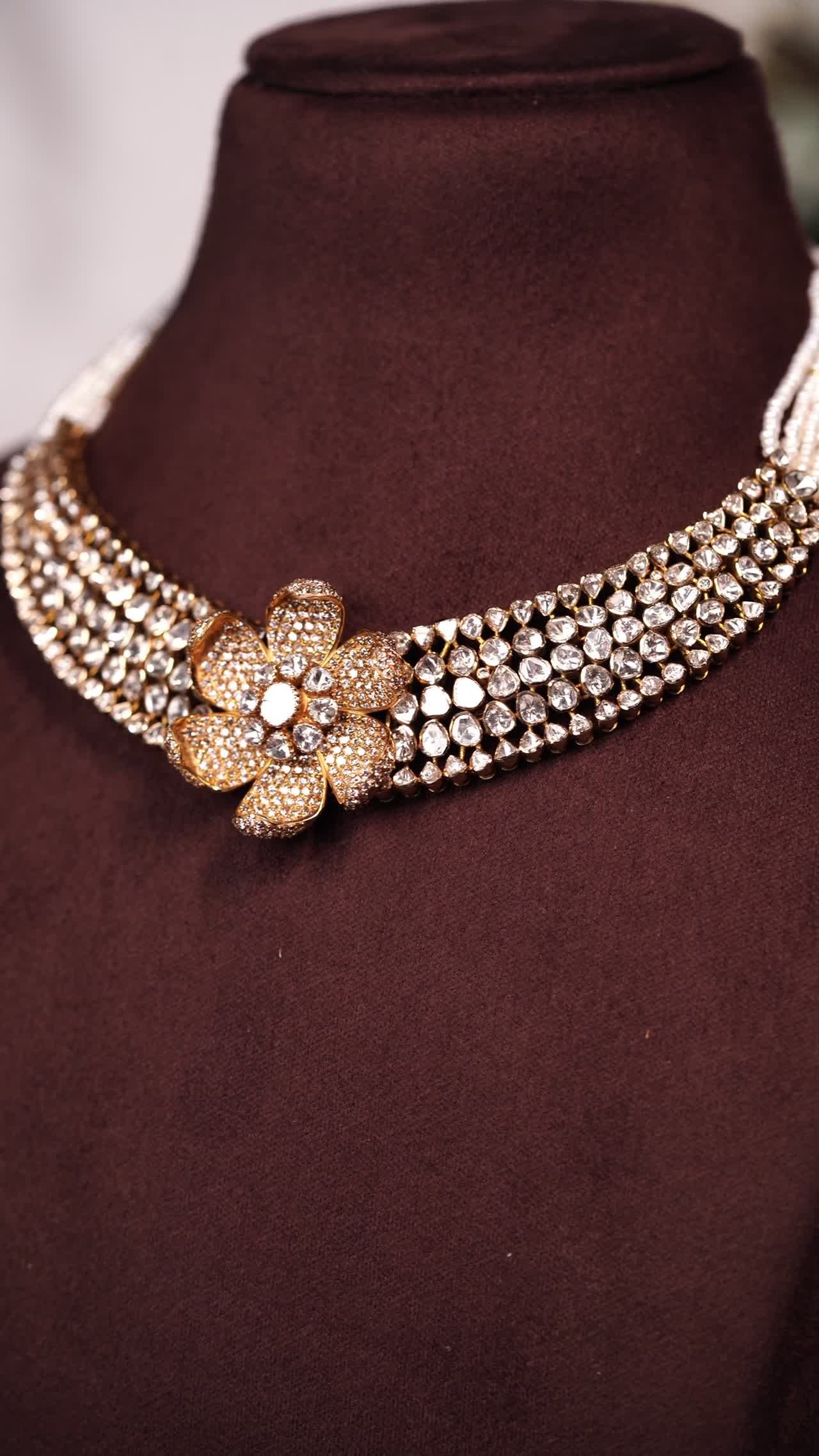 A polki diamond choker necklace with a central flower motif and multi-layered sparkling diamond band.