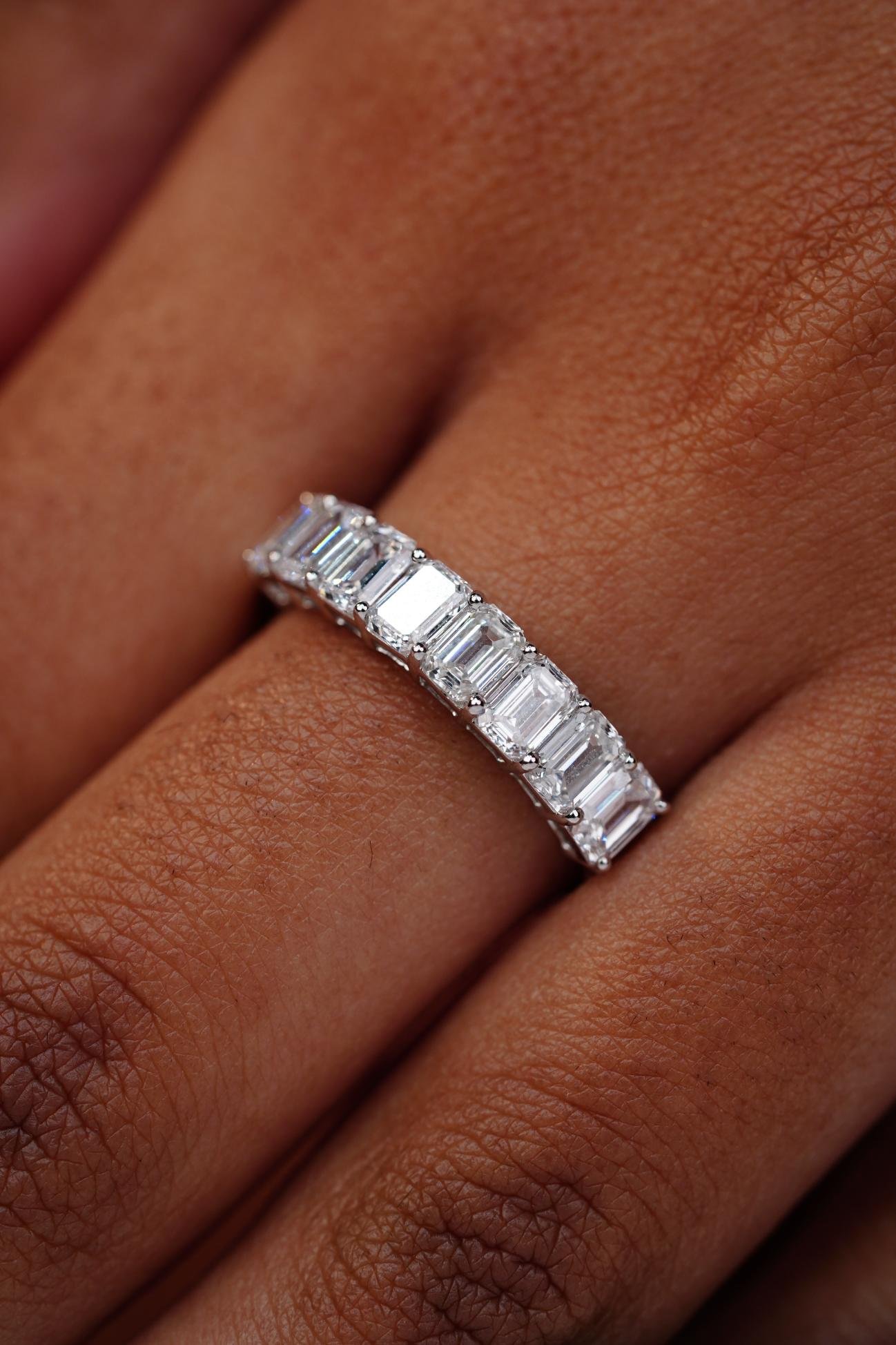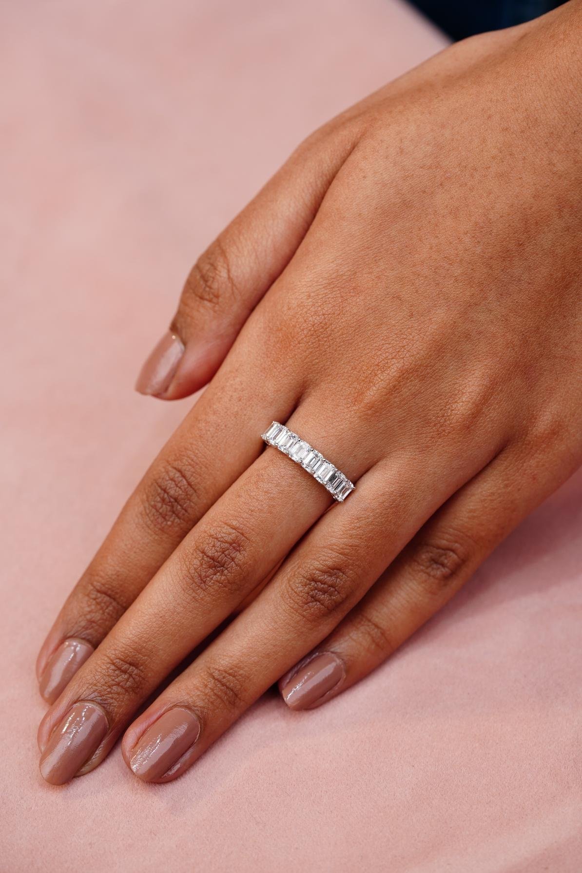 A classy band set with multiple baguette-cut diamonds in a shared-prong channel setting.