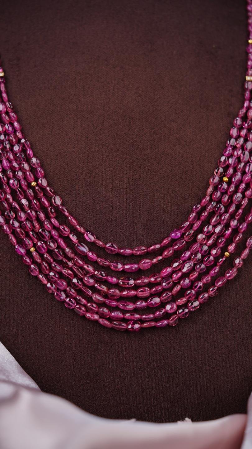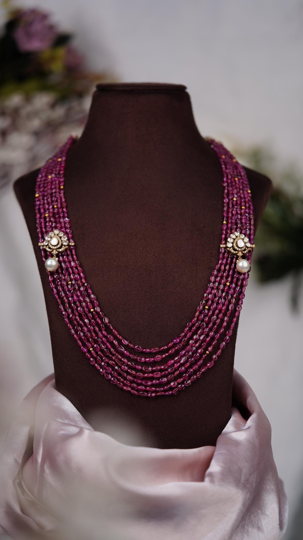This is a pink beaded multi-strand necklace with gold-toned decorative clasp pieces featuring pearl accents on each end.