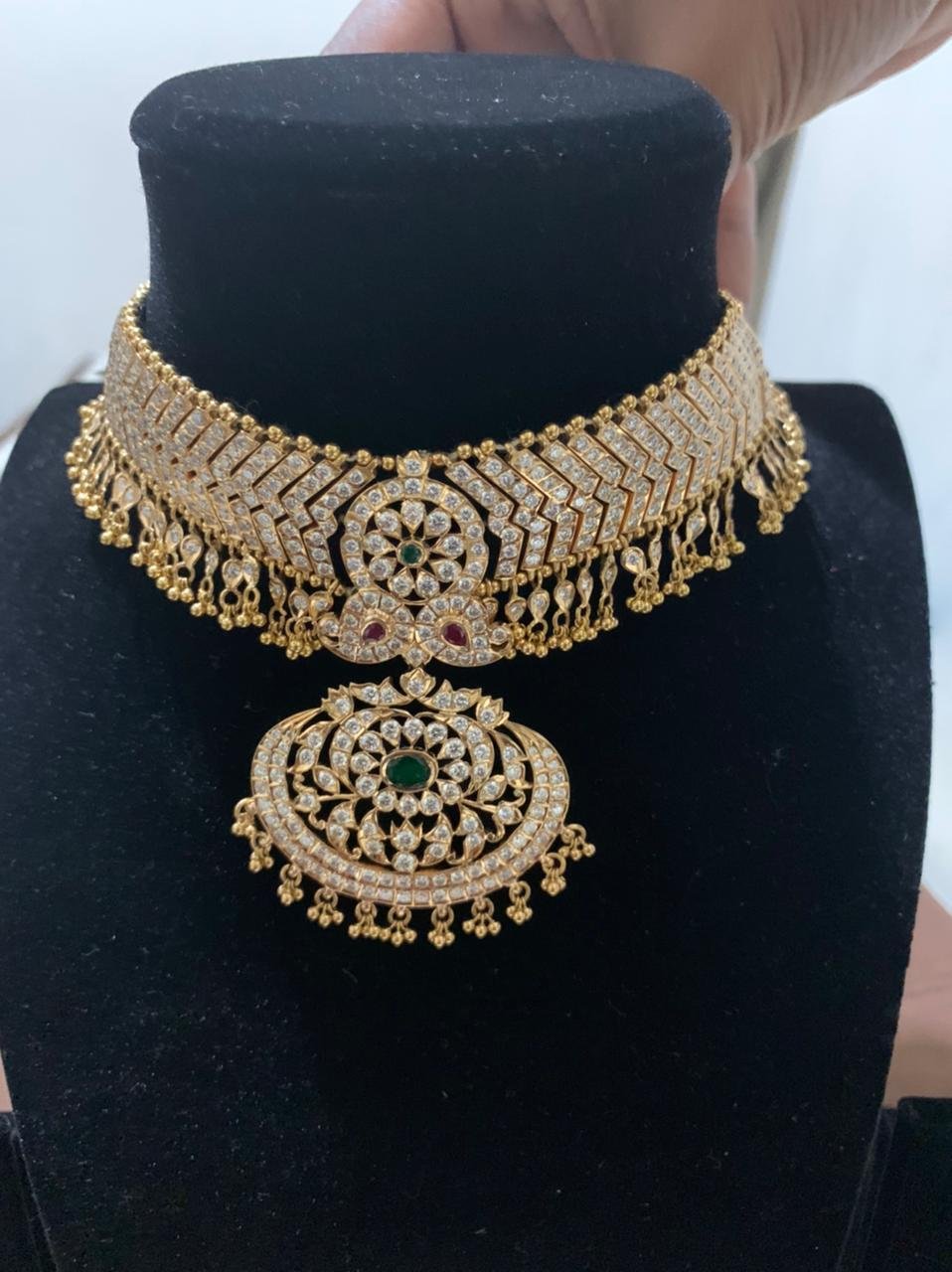 An elegant gold choker set with sparkling diamonds, emerald accents, and a grand pendant, perfect for regal, festive looks.