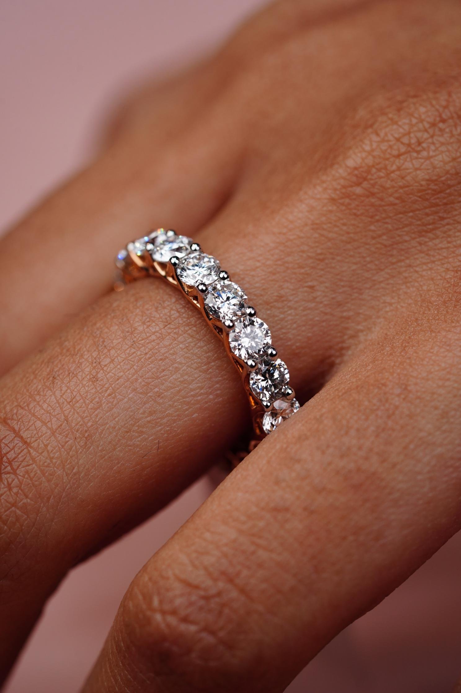 A diamond-studded band ring with multiple stones set in a continuous line.
