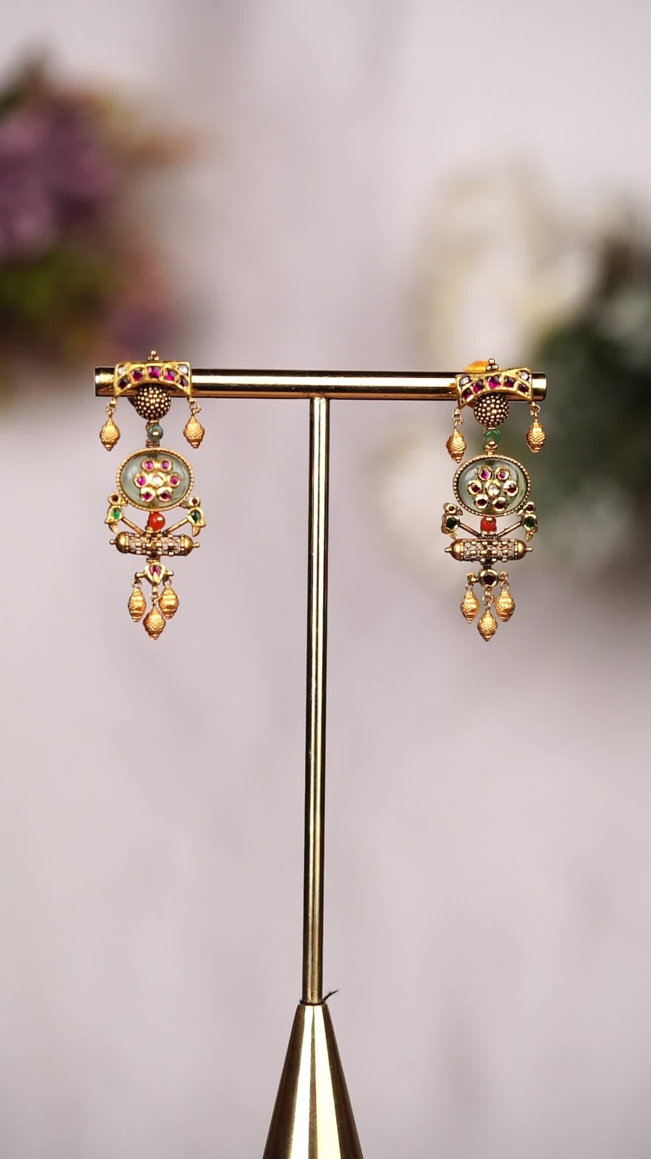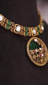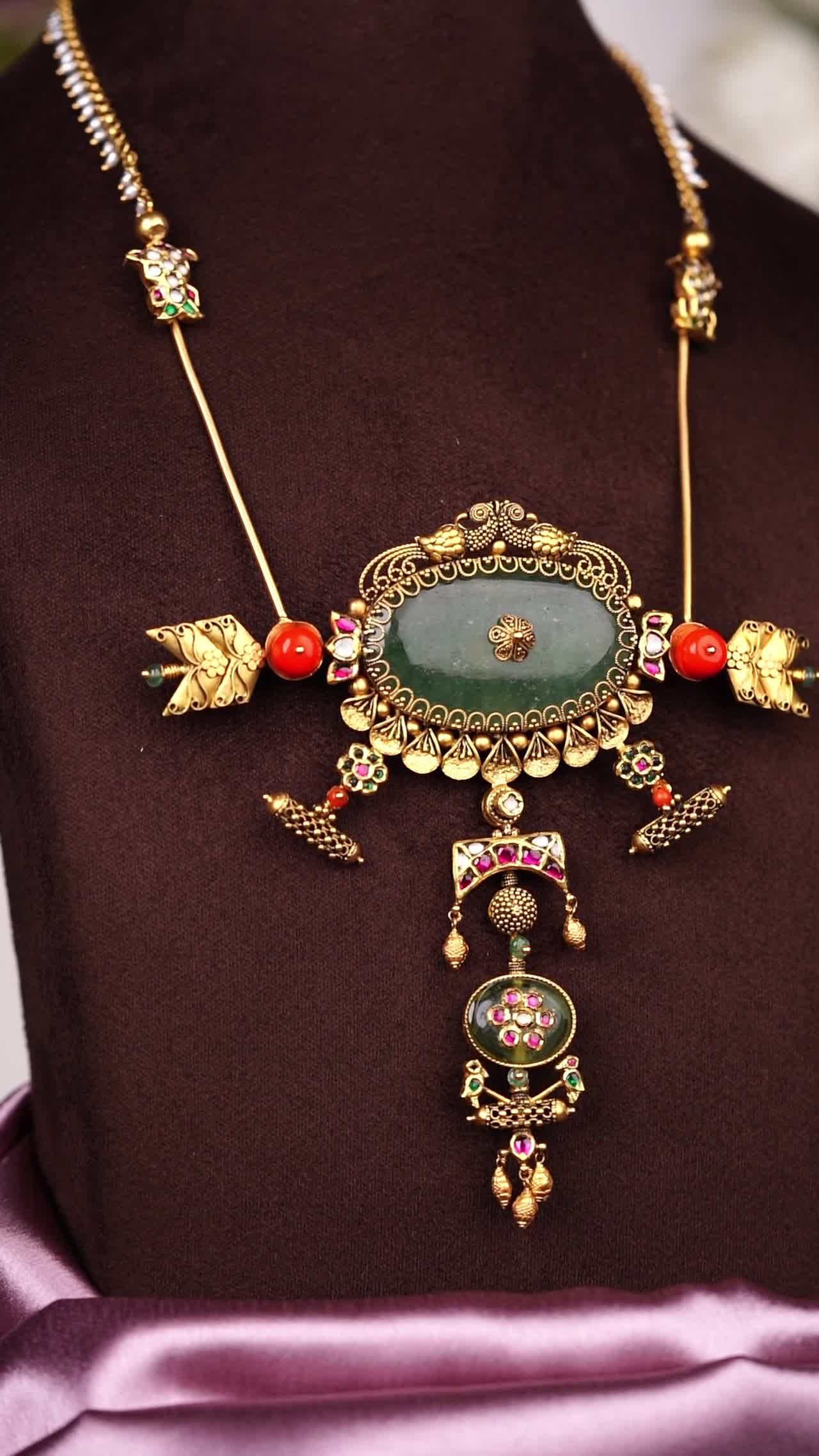 A luxurious gold necklace featuring a central green jade pendant surrounded by intricate filigree, coral beads, and dangling gold accents.
