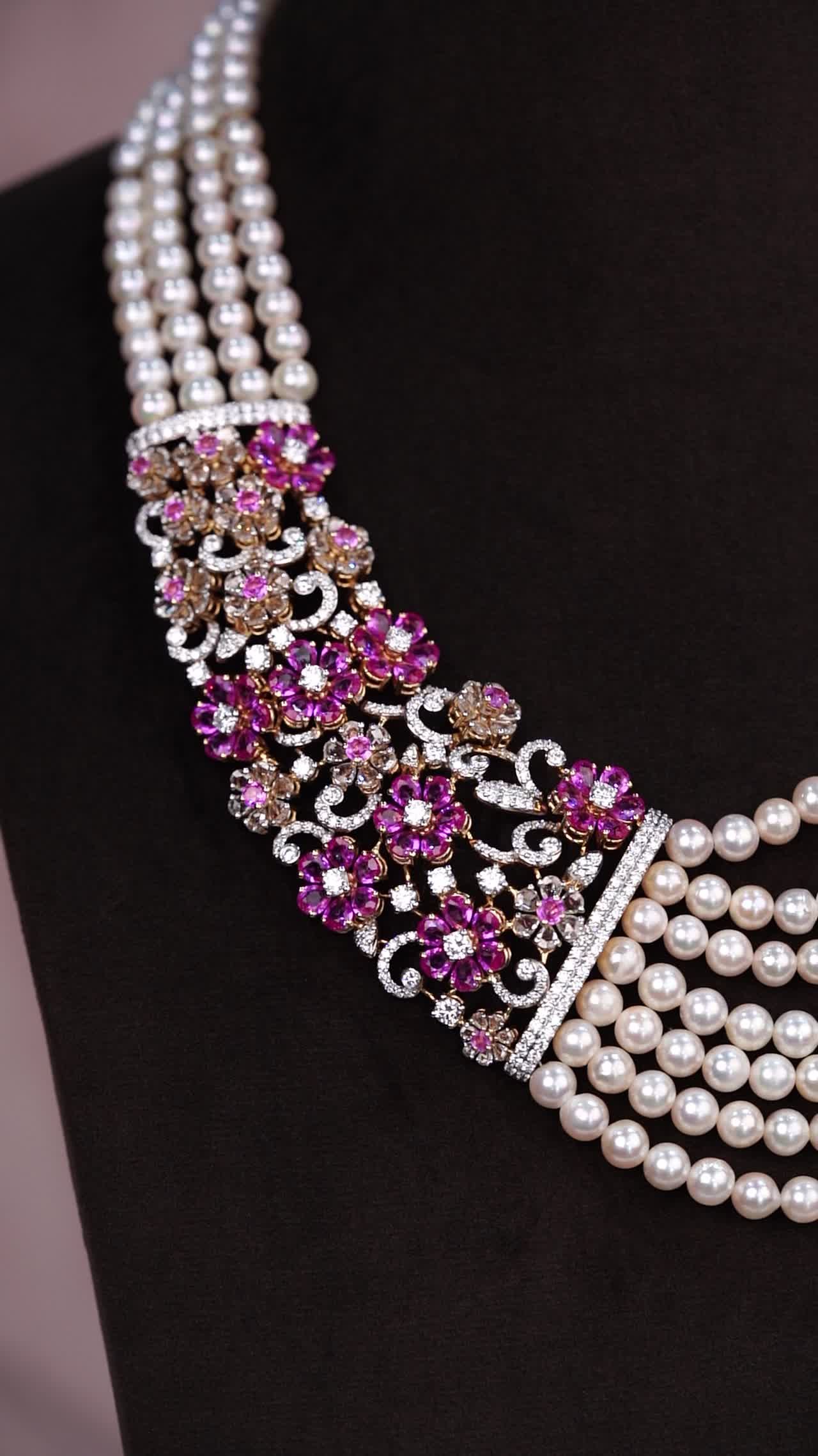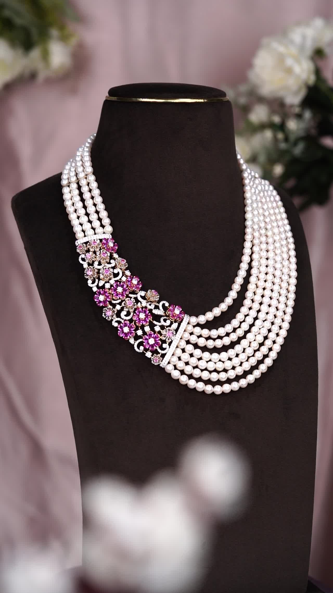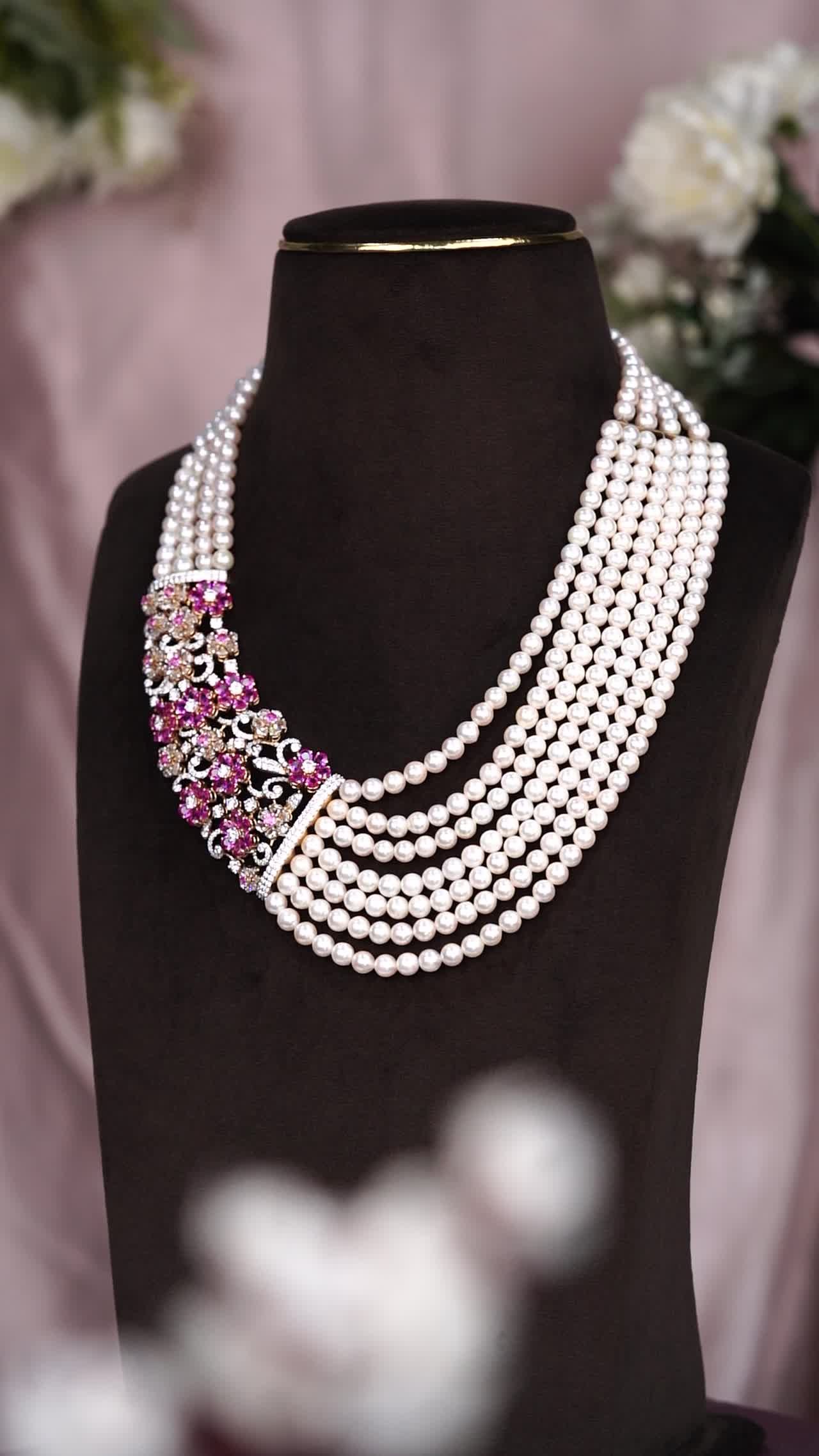 A graceful layered pearl necklace accented with lab-grown rose cut diamonds for a soft, elegant sparkle.