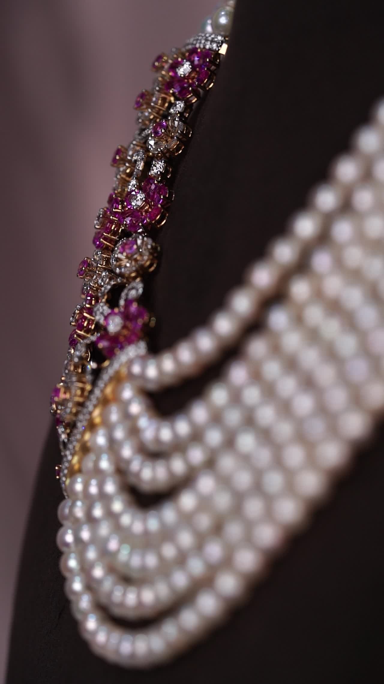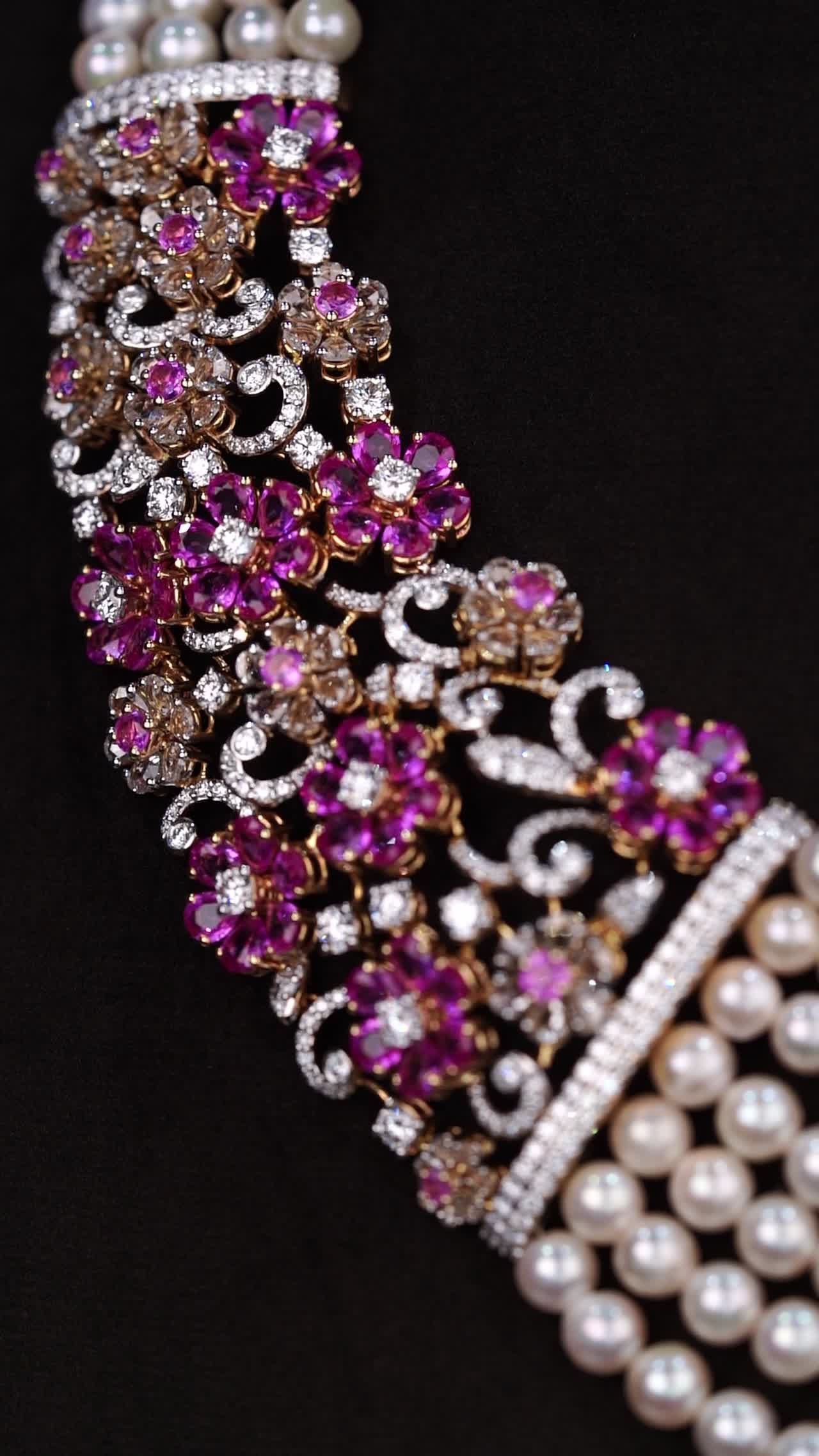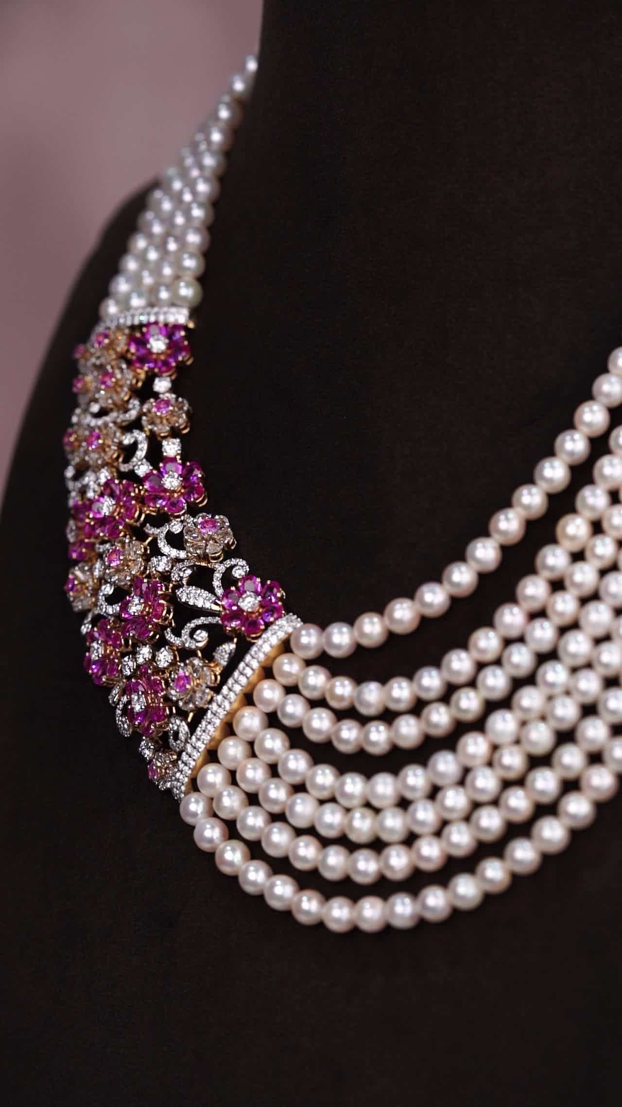 A graceful layered pearl necklace accented with lab-grown rose cut diamonds for a soft, elegant sparkle.