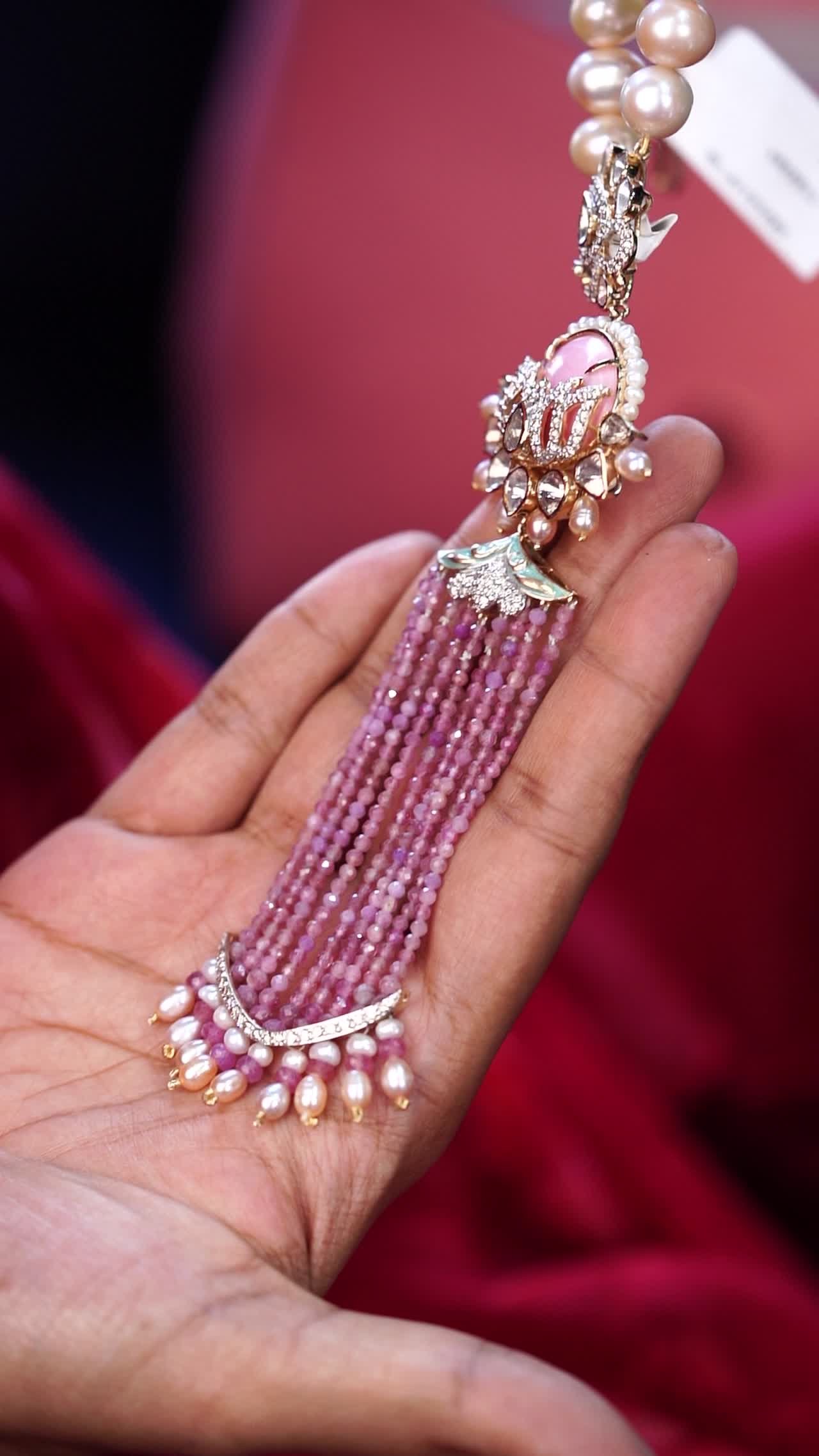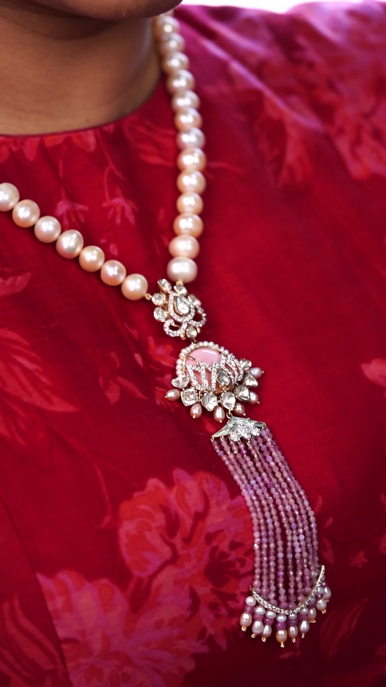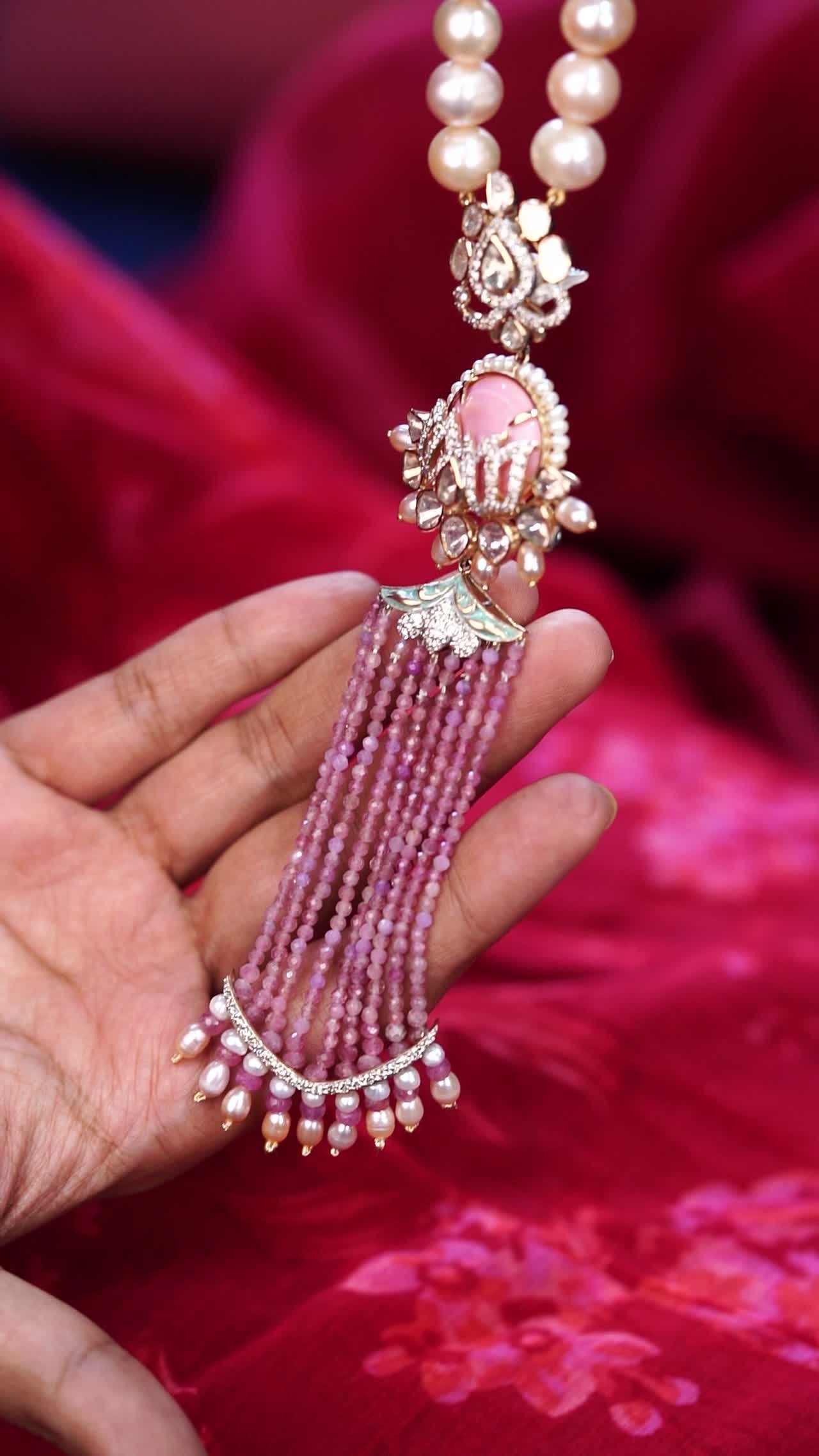A luxurious long necklace with pearl beads and a large, diamond-studded pink-stone pendant featuring cascading pink bead tassels.