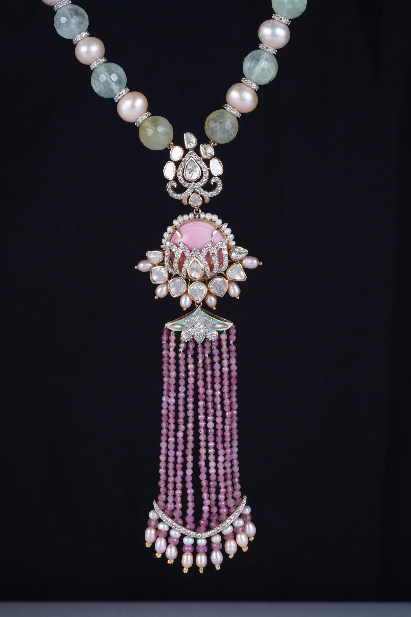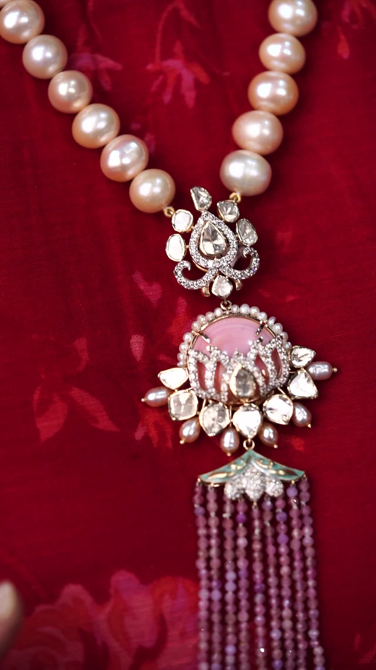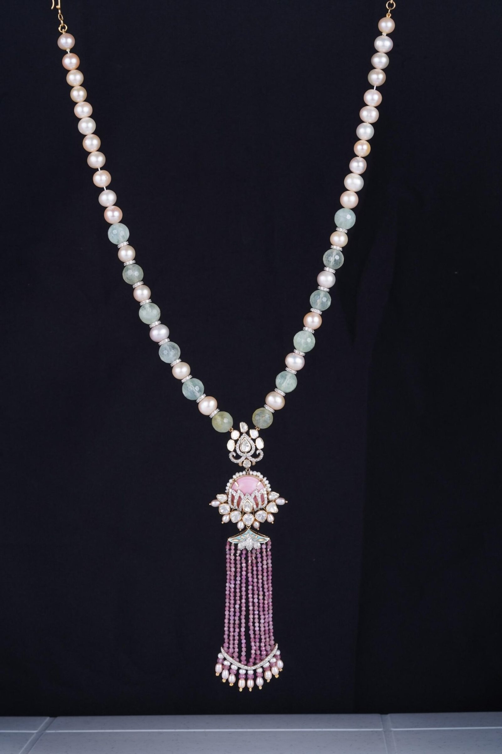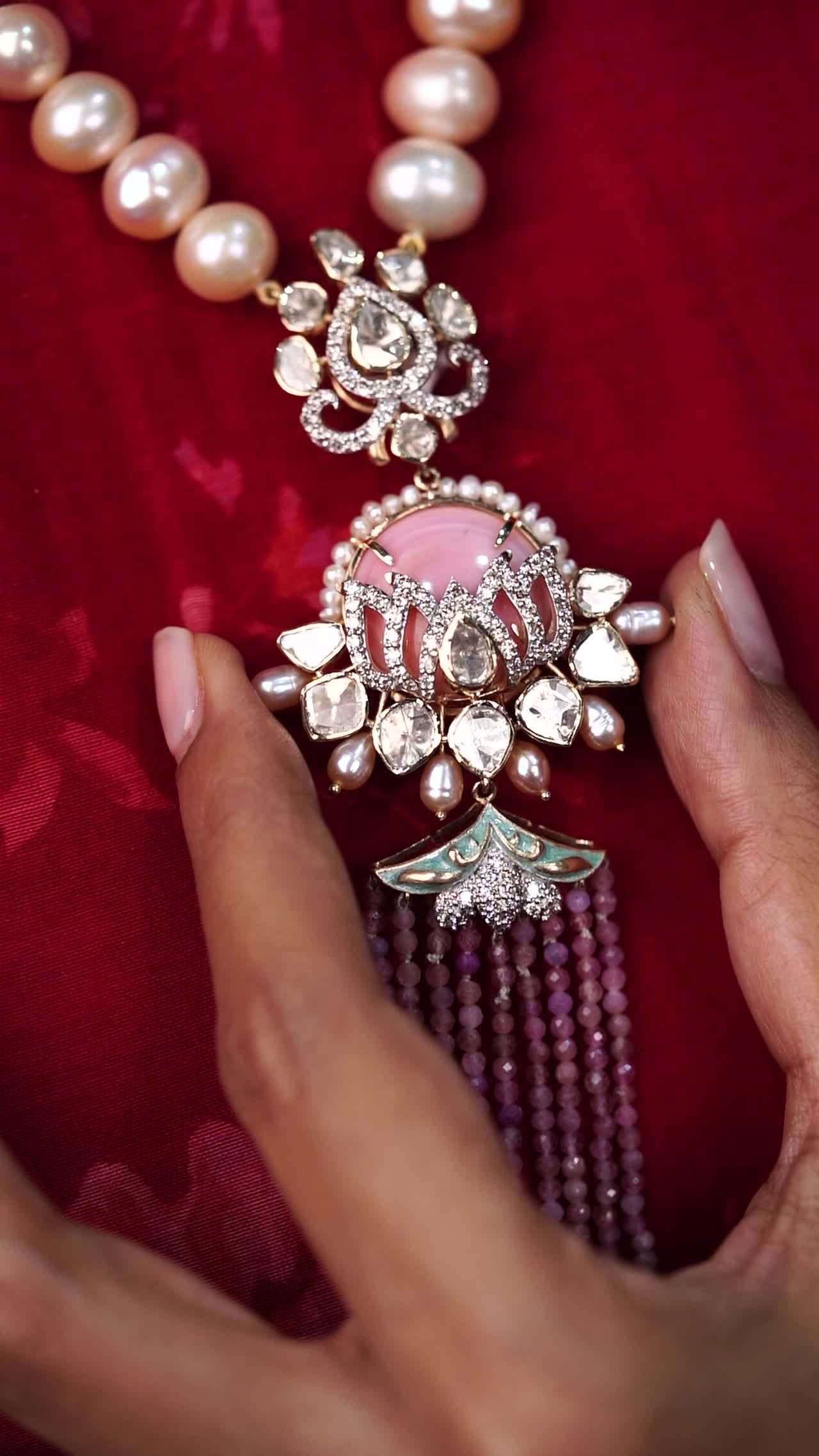 A luxurious long necklace with pearl beads and a large, diamond-studded pink-stone pendant featuring cascading pink bead tassels.
