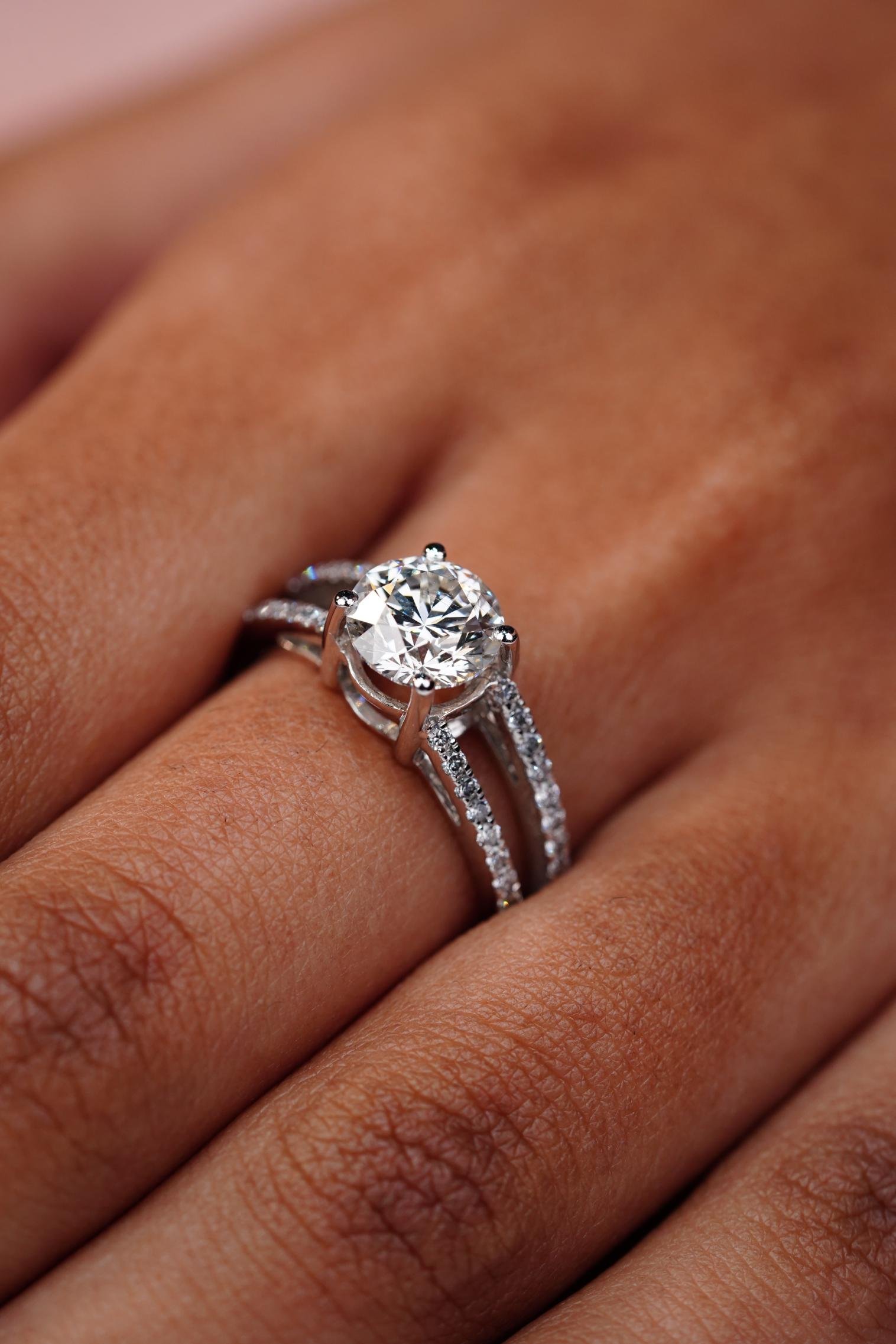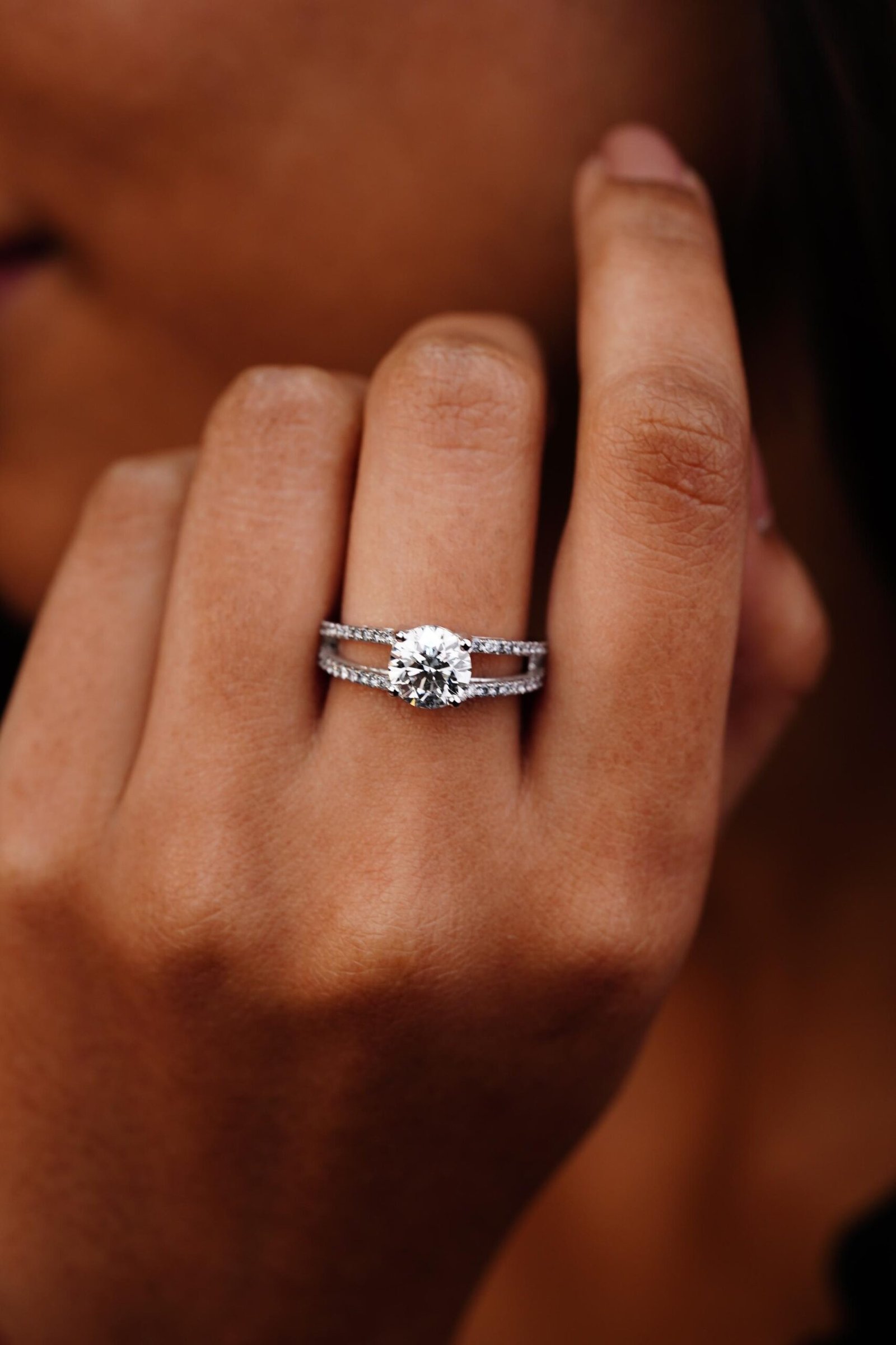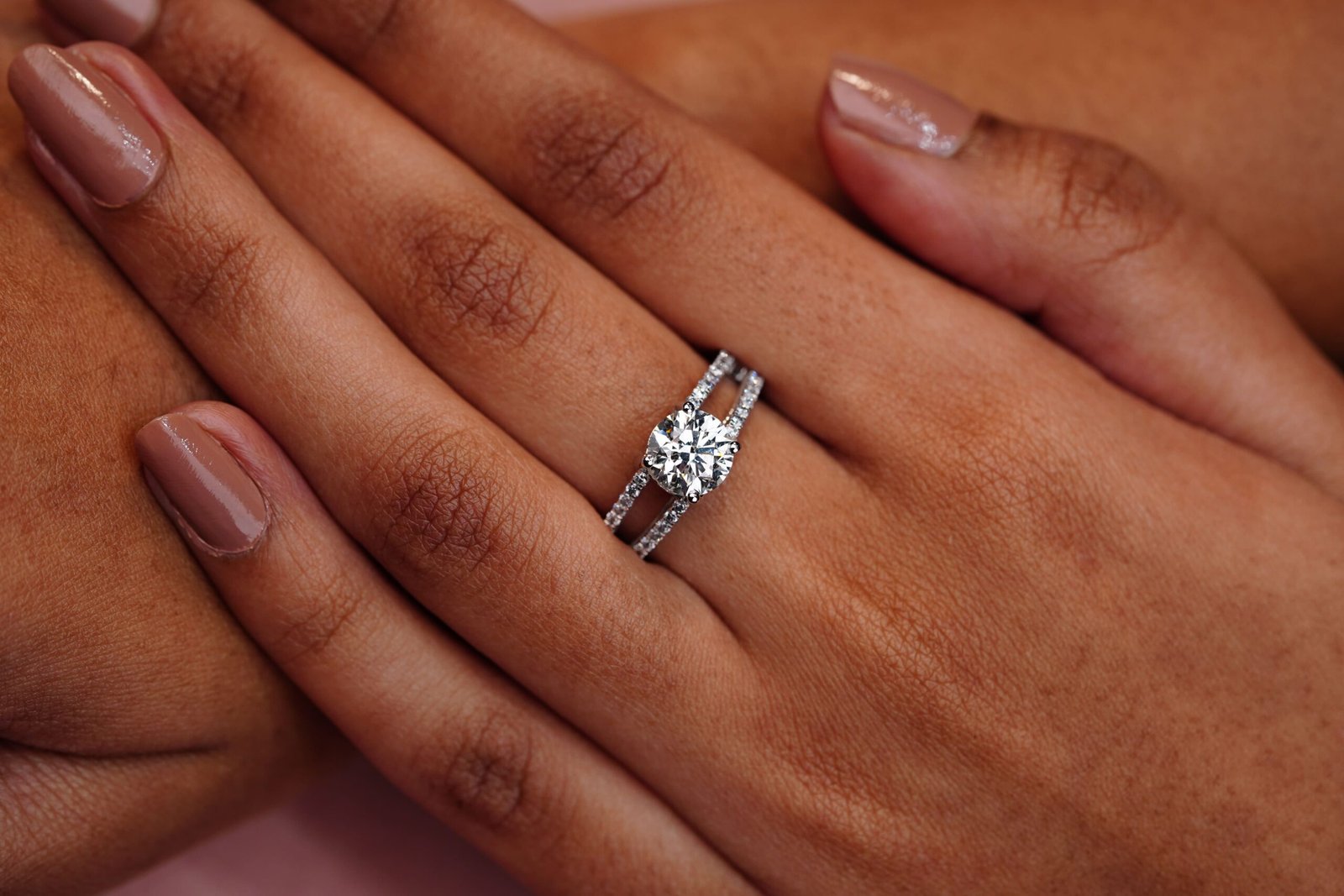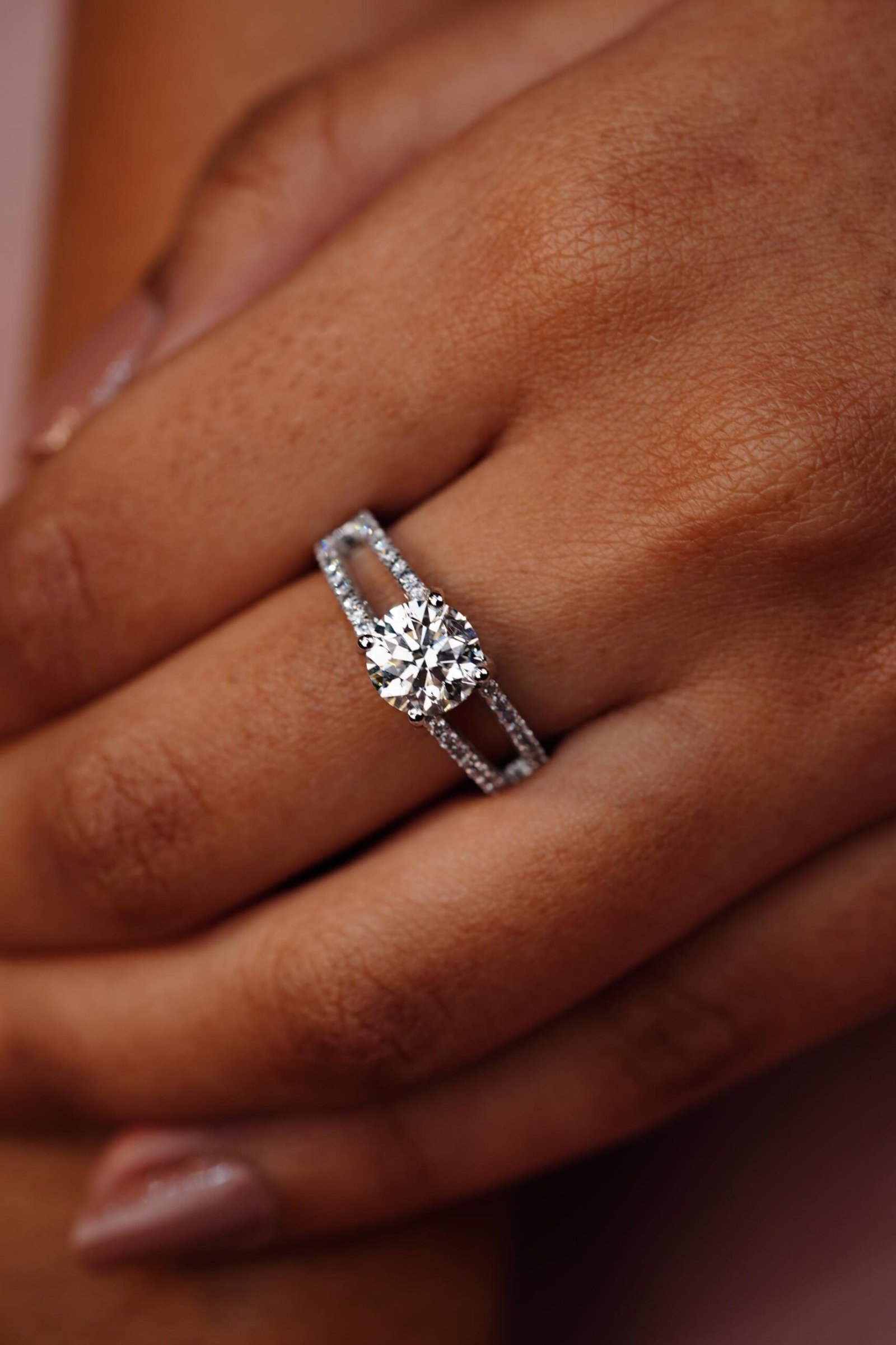An engagement ring with a center diamond surrounded by smaller accent diamonds on double layer band.