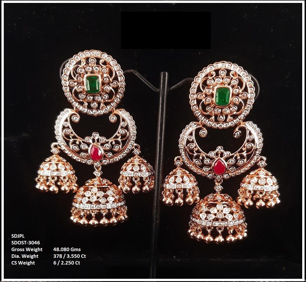 Elegant rose gold jhumka earrings studded with sparkling diamonds, emerald & ruby accents, perfect for festive glamour.