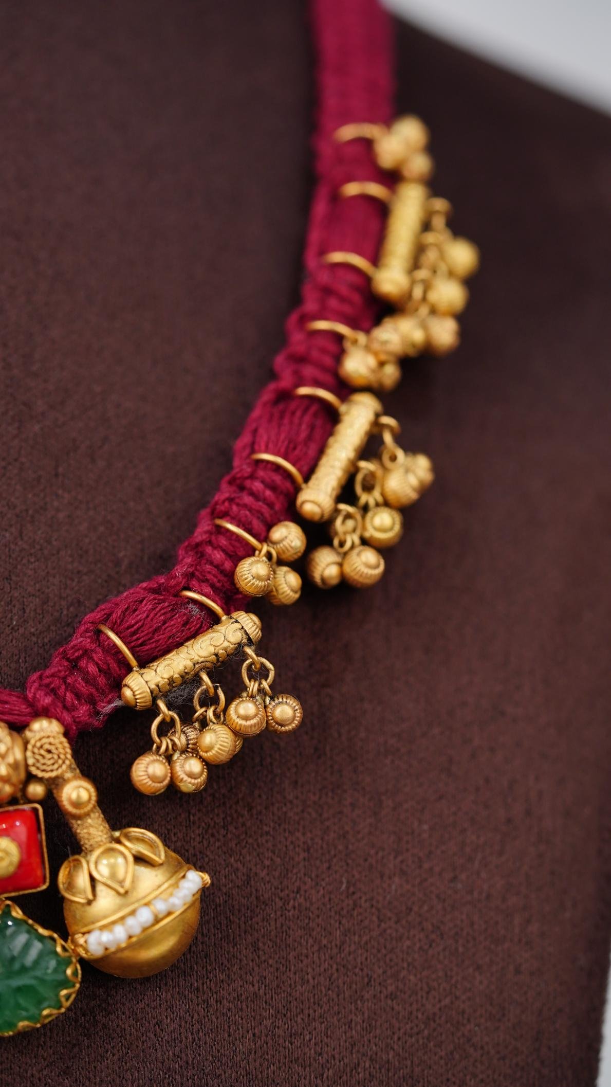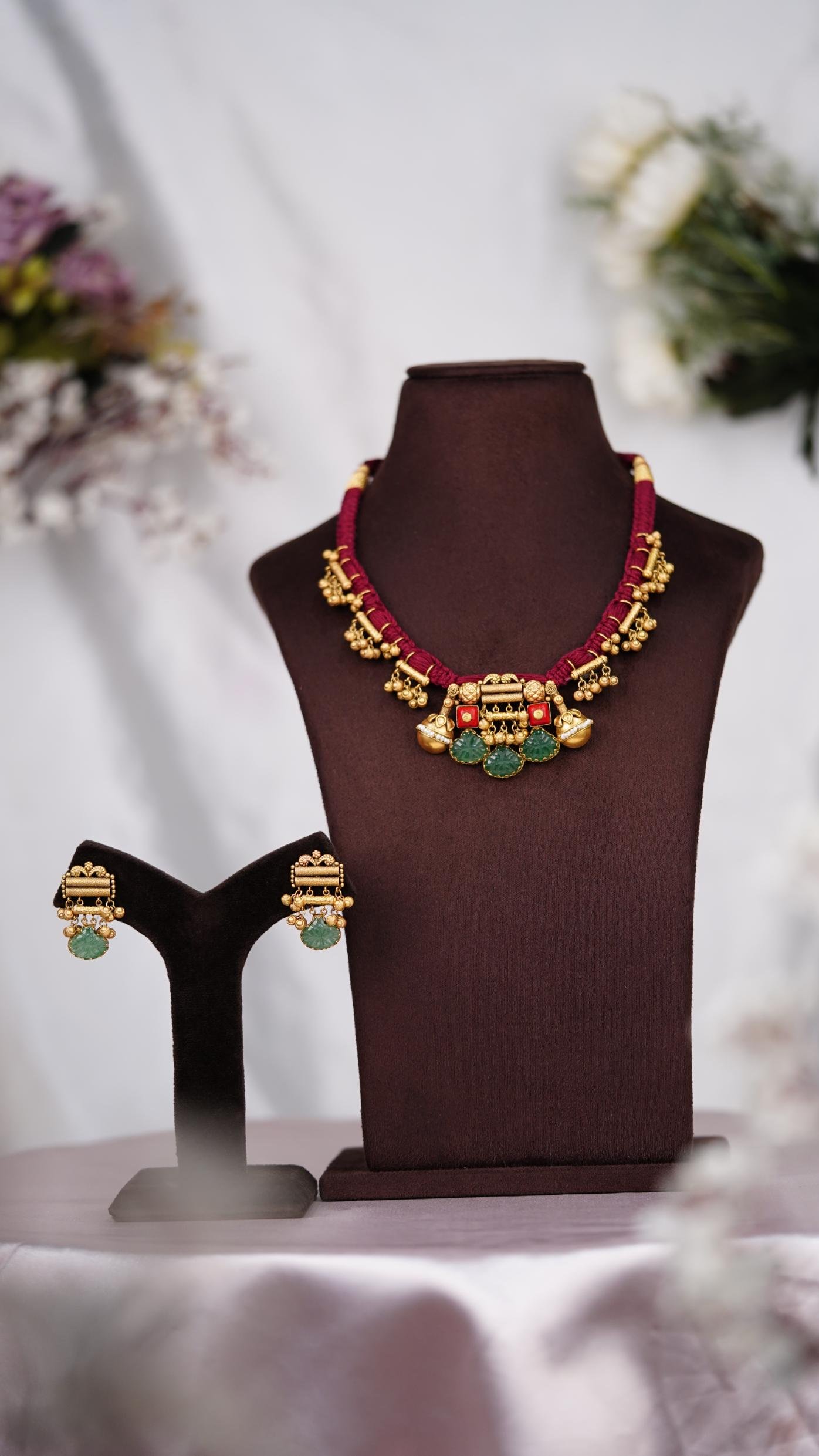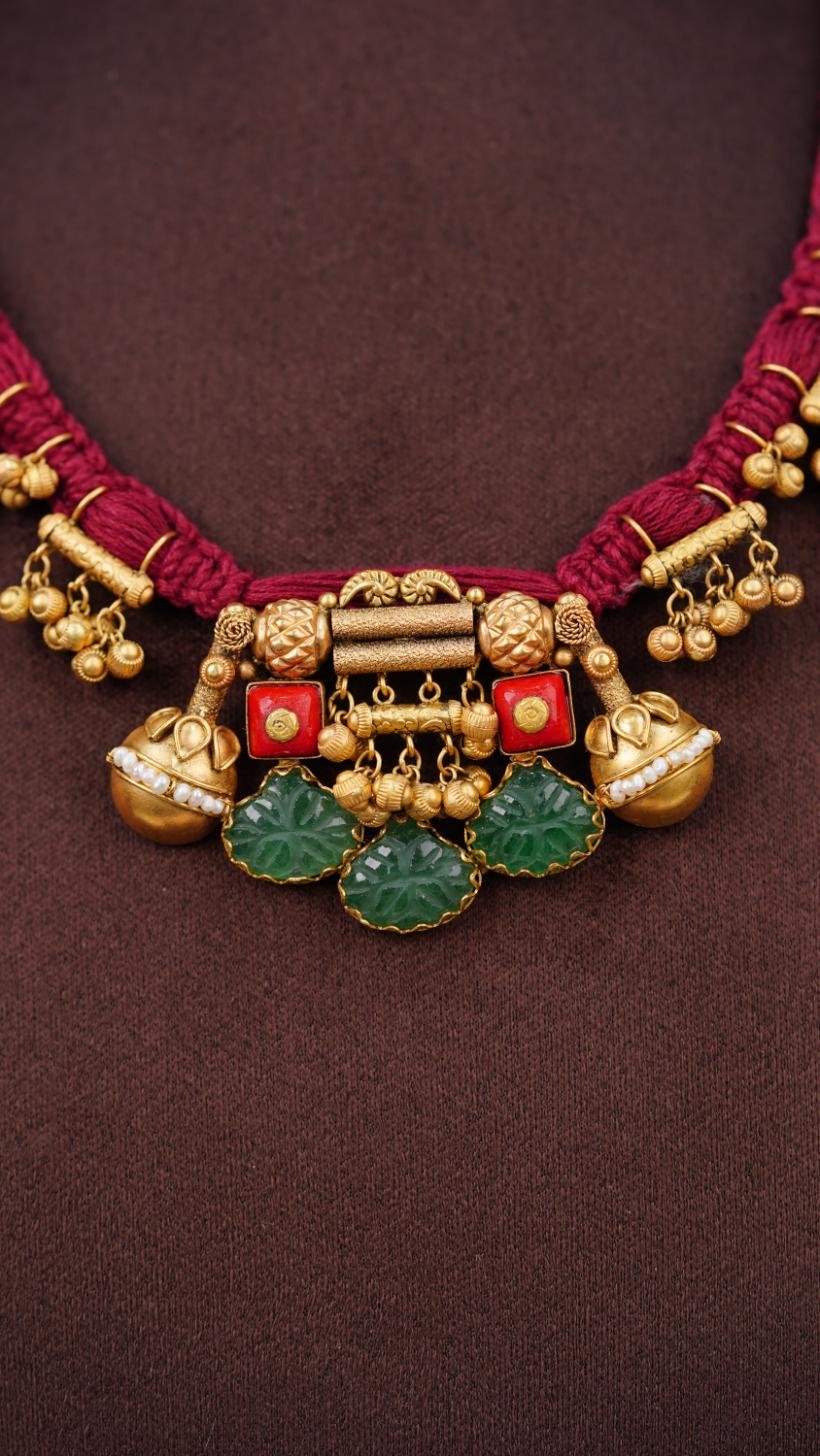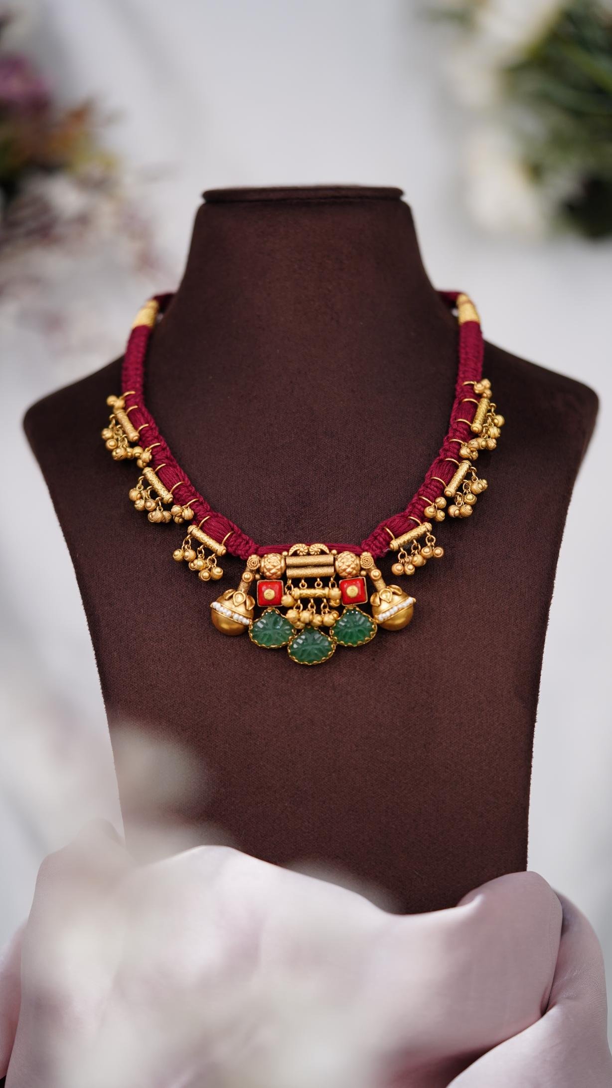 A traditional gold-toned necklace with maroon fabric thread and green gemstone accents, featuring intricate beadwork and dangling gold jhumkas.