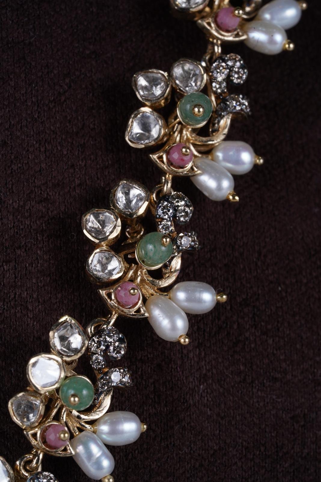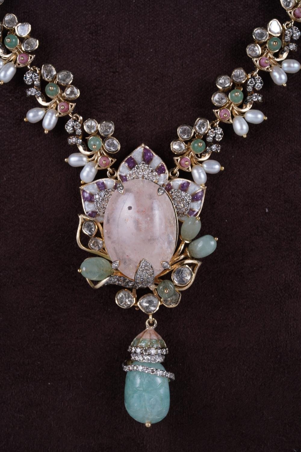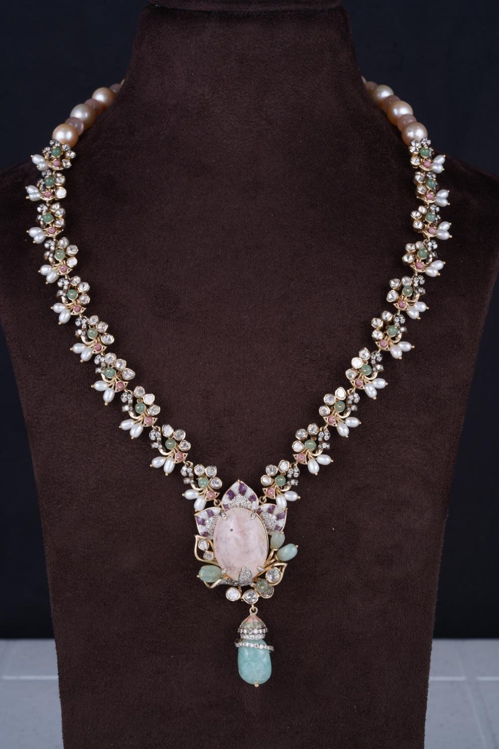This necklace features a large pink oval stone surrounded by floral clusters of white, pastel pink, and green gems with gold settings, and a teal drop pendant at the bottom.