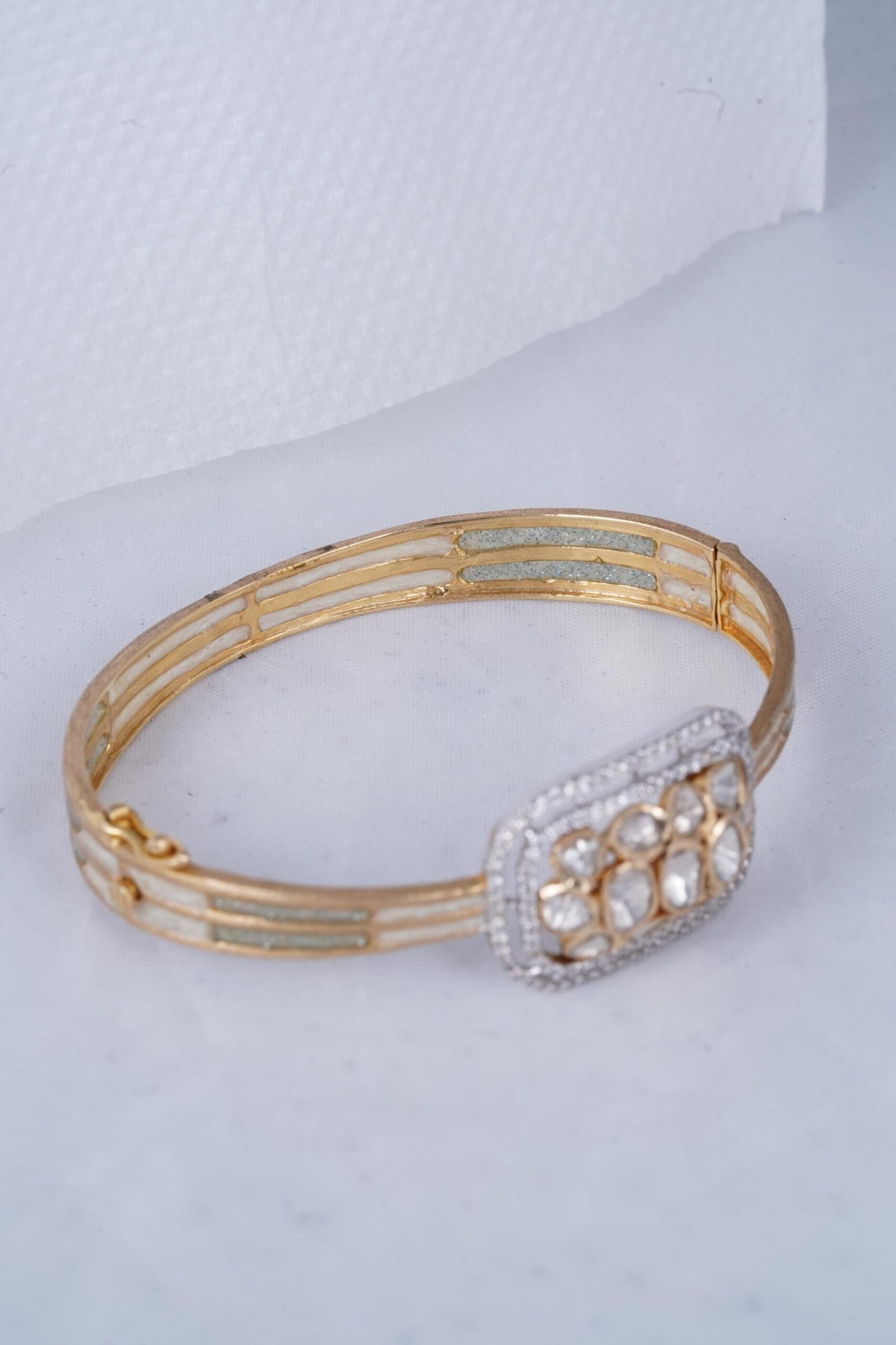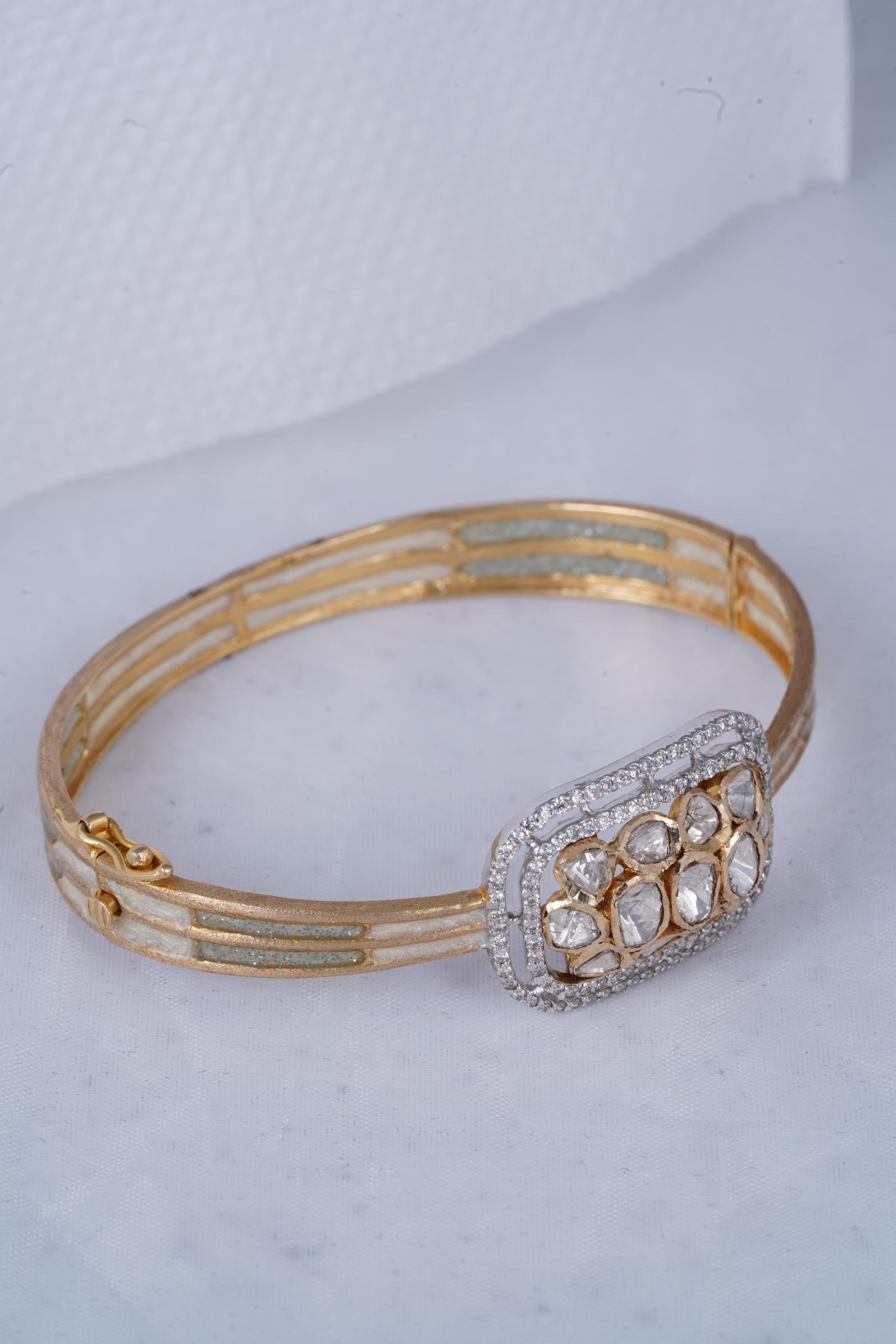 This elegant gold polki bangle features a rectangular centerpiece set with large transparent polki stones surrounded by a sparkling diamond border.
