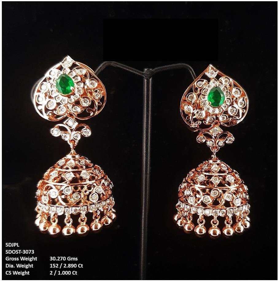 Elegant rose‑gold jhumka earrings featuring intricate diamond‑studded peacock motifs with emerald and ruby accents, perfect for festive glamour.