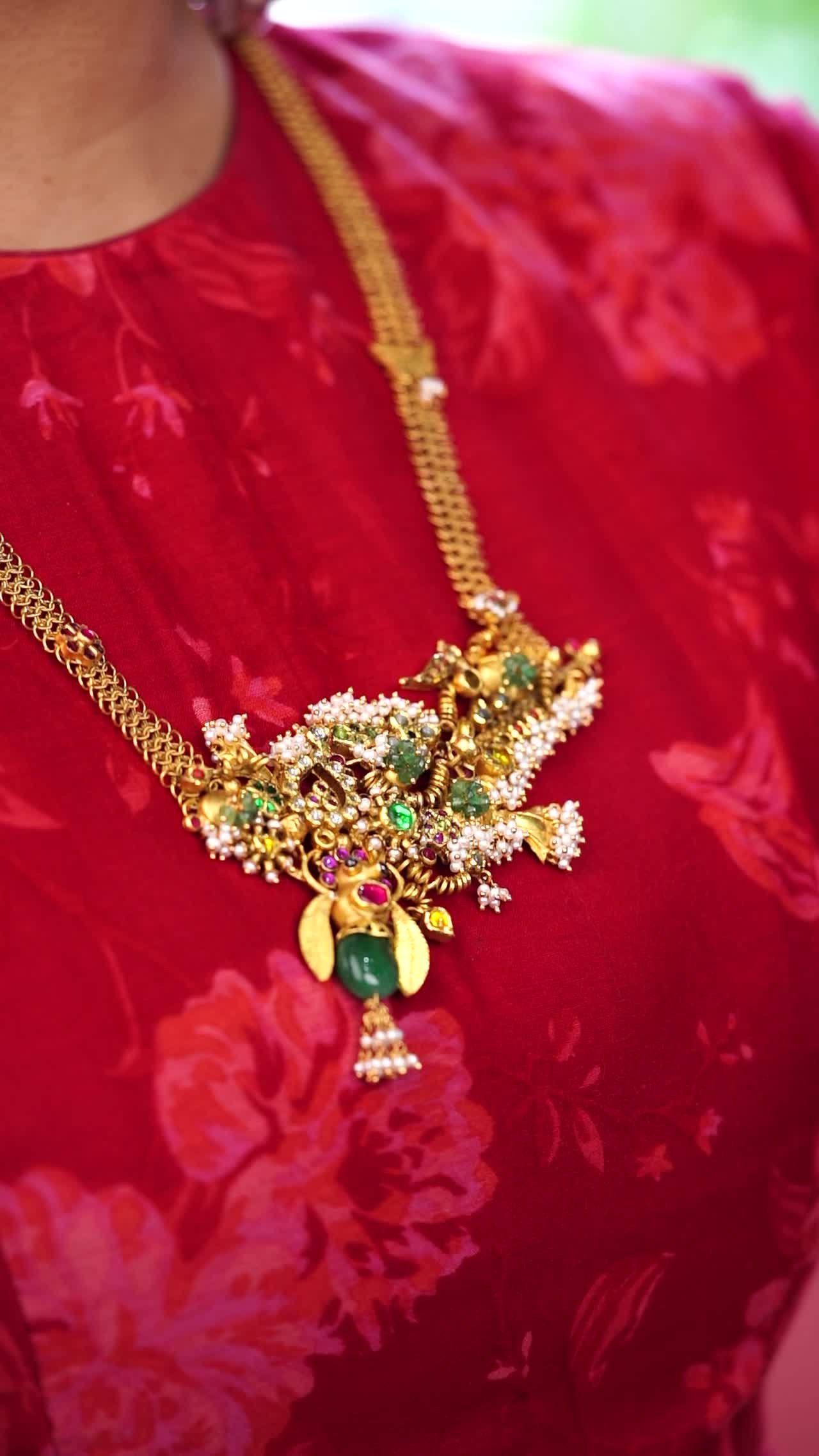 This is a gold-toned traditional dragon-shaped necklace featuring emerald and ruby gemstones with pearl accents, designed as an ornate pendant.