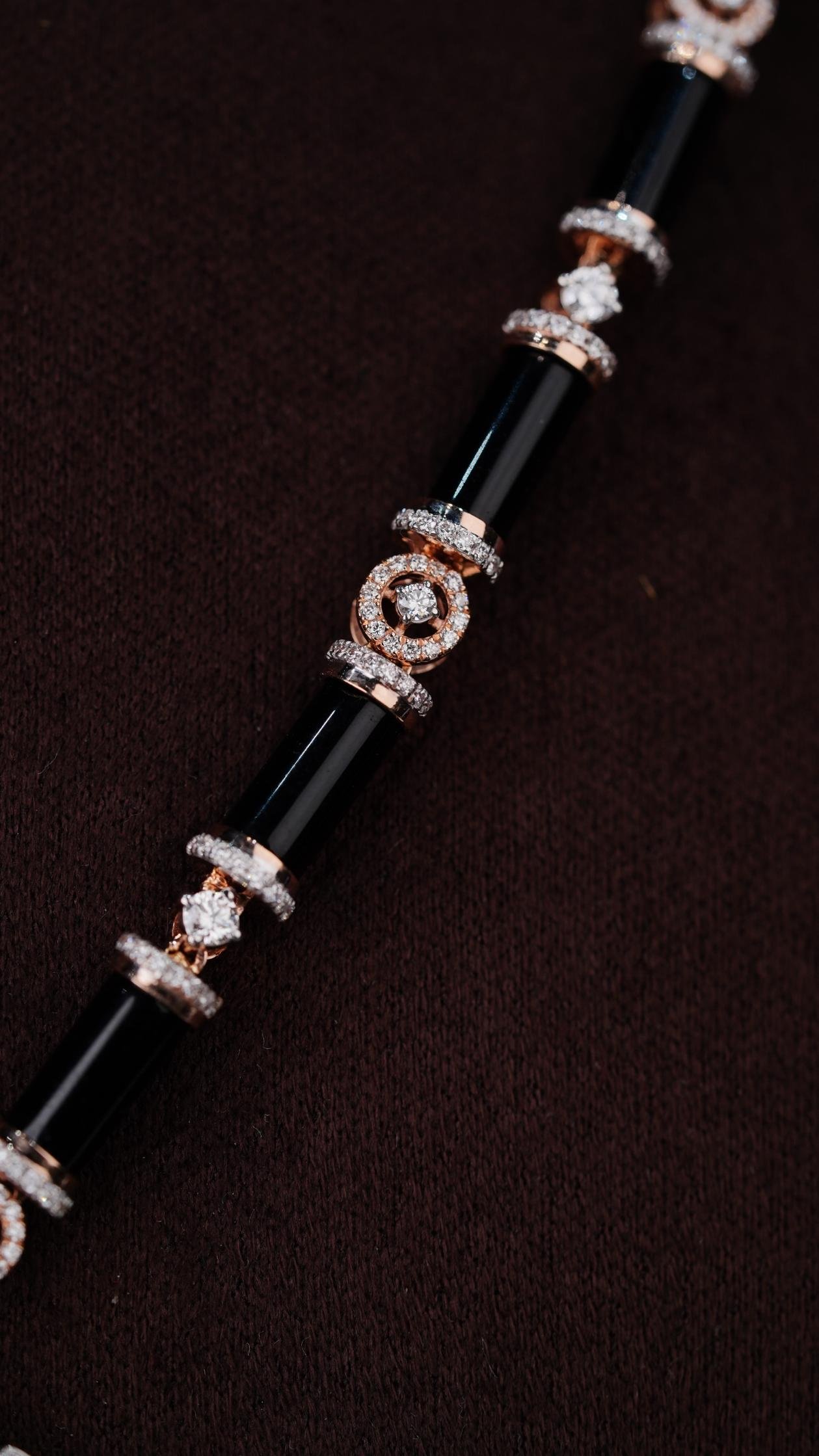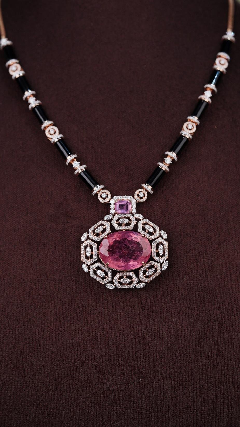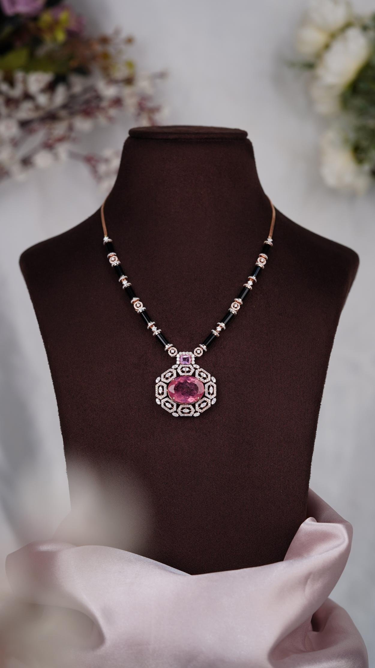 A chain necklace with black bead accents and a pink gemstone pendant framed in a diamond-cut halo.