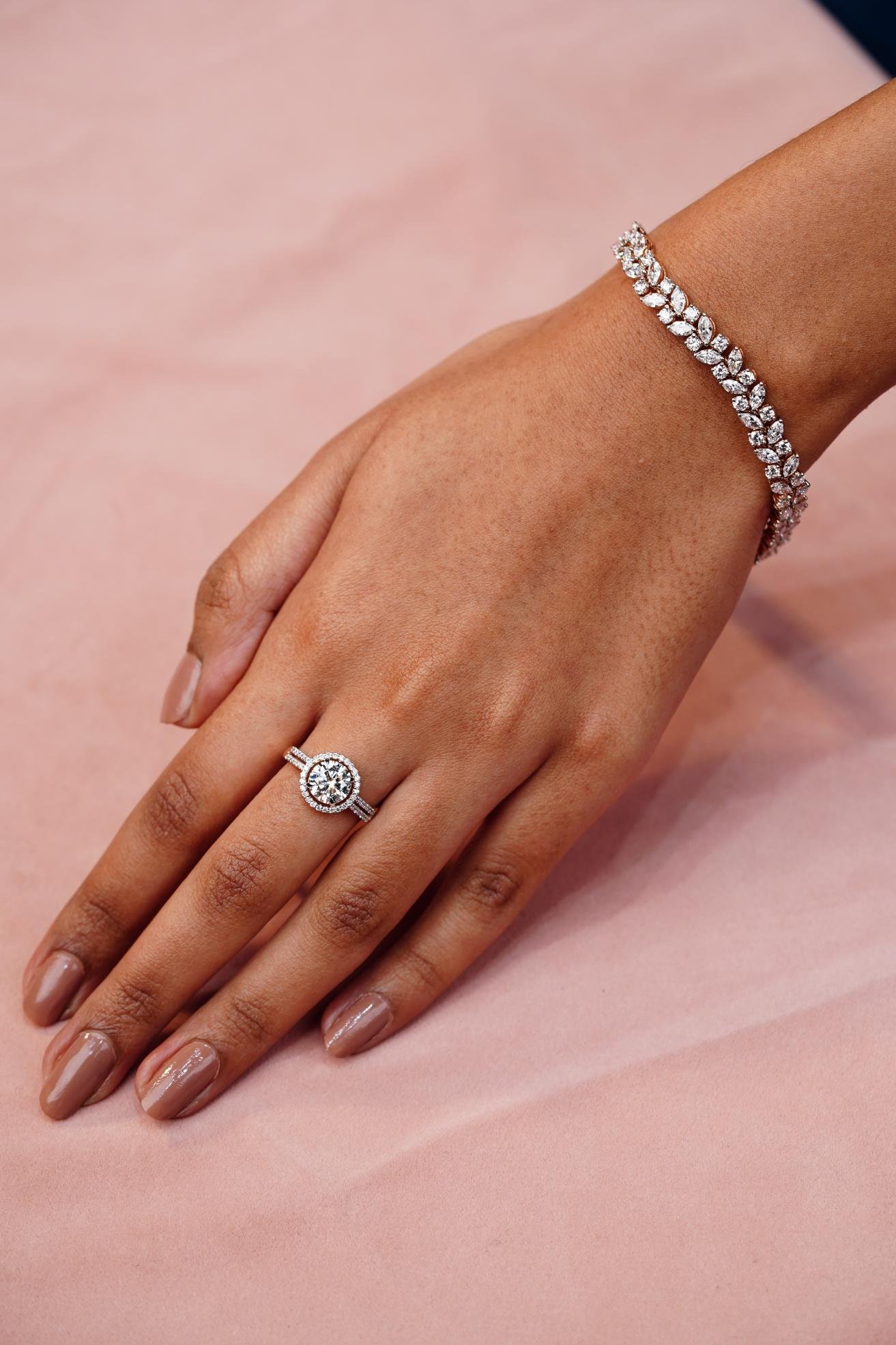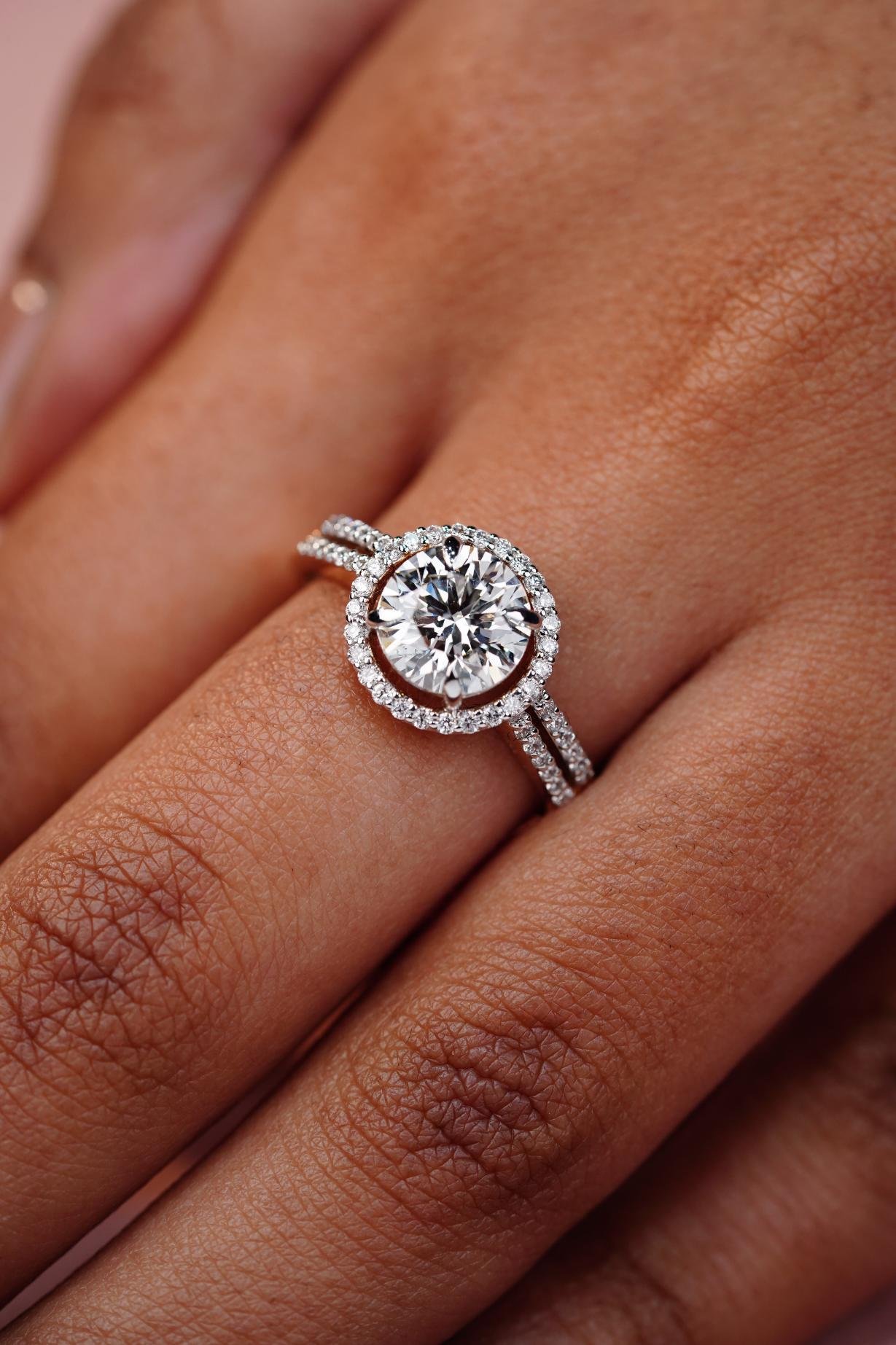 An engagement ring with a round center diamond surrounded by a halo of smaller diamonds and diamond accents on the band.