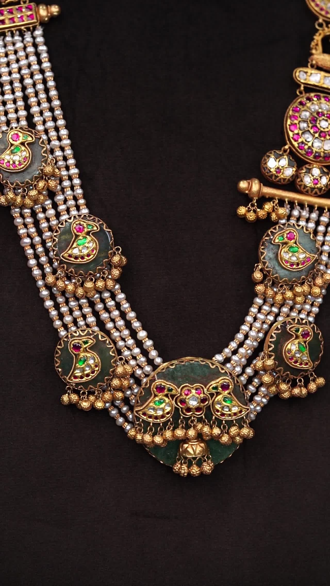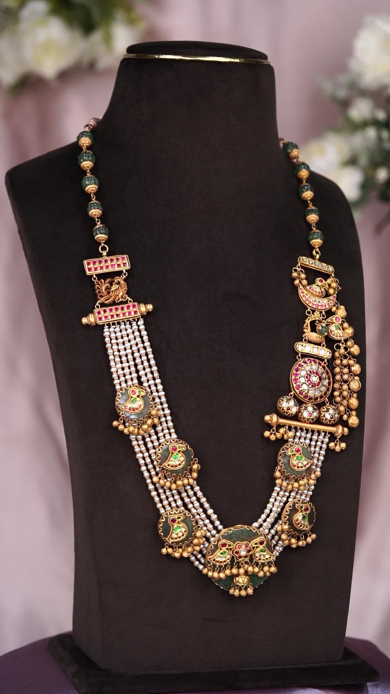 A majestic bird haram featuring layered pearl strands, intricate temple motifs, and graceful gold bead drops for a royal traditional look.